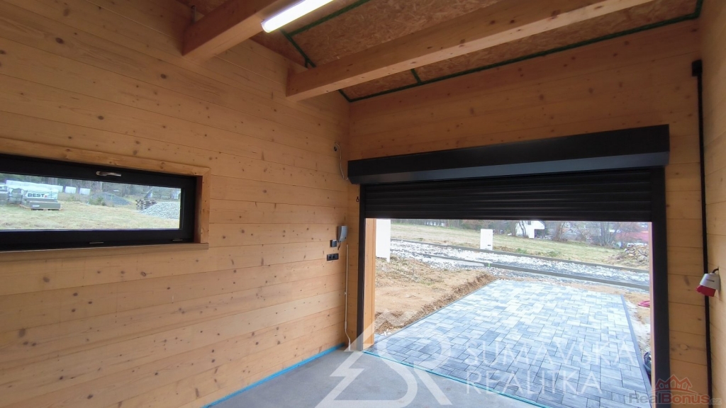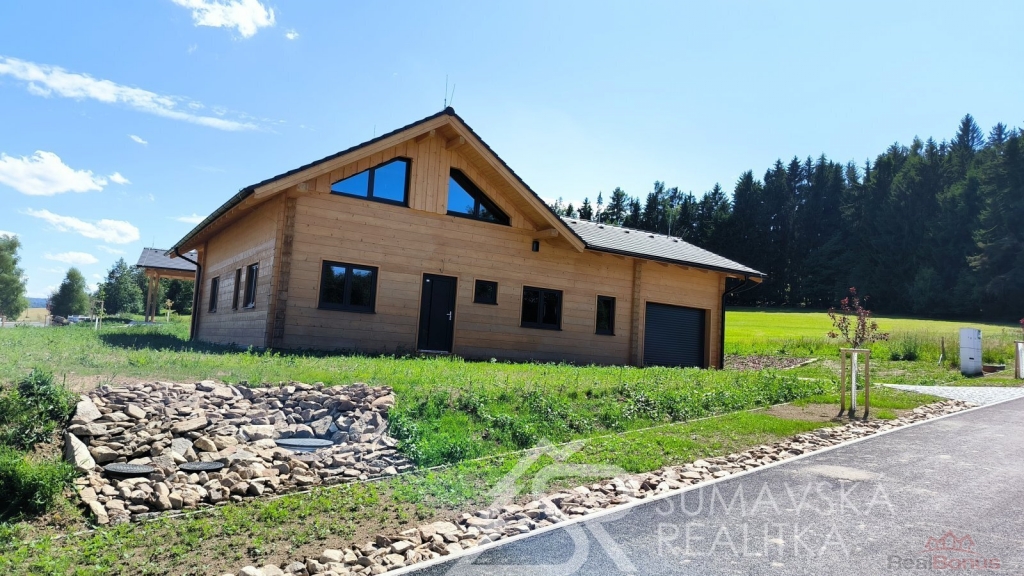 Popis nemovitosti: právě realizovaný rodinný dům je stavěný jako dřevostavba s roubenou obvodovou stěnou z lepených hranolů t.24 cm (bez sedání). Přírodní masivní dřevo je použito i uvnitř domů a vytváří tu správnou atmosféru. Dům je koncipován do tvaru L s vlastní garáží na straně jedné a s velkorysým otevřeným obývacím pokojem s terasou na straně druhé. Uvnitř se nachází dvě ložnice (se šatnou), koupelna, samostatné WC, technická místnost a chodba. Pro užívání je připraveno i podkroví. Střešní krytina je Bramac Tegalit Protector, okna PVC Vekra, sanita od značek Villeroy Boch, Hans Grohe a Riho. Stavba je dokončena s použitím kvalitních standardů (podlahová krytina vinil, vypínače ABB Zoni v černé barvě a bezfalcové dveře). Stejně tak koupelny jsou voleny v materiálech a odstínech k přírodnímu dřevu. Vytápění zajišťuje tepelné čerpadlo Panasonic. Pro případného zájemce se mohou standardy upravit na přání.
