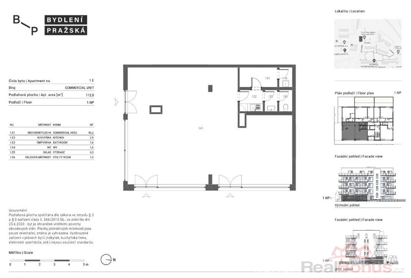 Disp.: obchodní plocha 96,2 m2, kuchyňka 2,9 m2, umývárna 1,6 m2, WC 1,6 m2, sklad 4,3 m2, úklidová místnost 1,5 m2.
