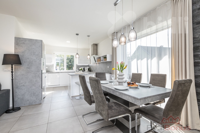 Dominantou domu je prostorný obývací pokoj propojený s kuchyní a jídelní částí. Kuchyňská linka byla vyrobena truhlářem na míru a je vybavena veškerými vestavěnými elektrospotřebiči. Součástí kuchyně je také praktická spižírna. V obývacím pokoji je připraven prostor pro krb (vč. vyvložkovaného komínu).
