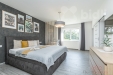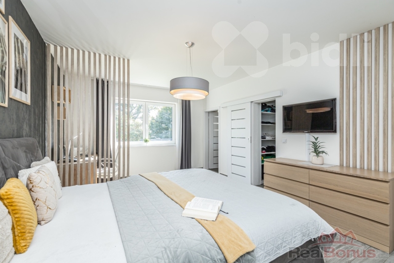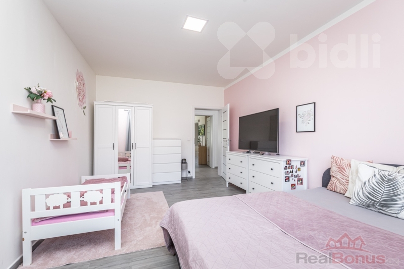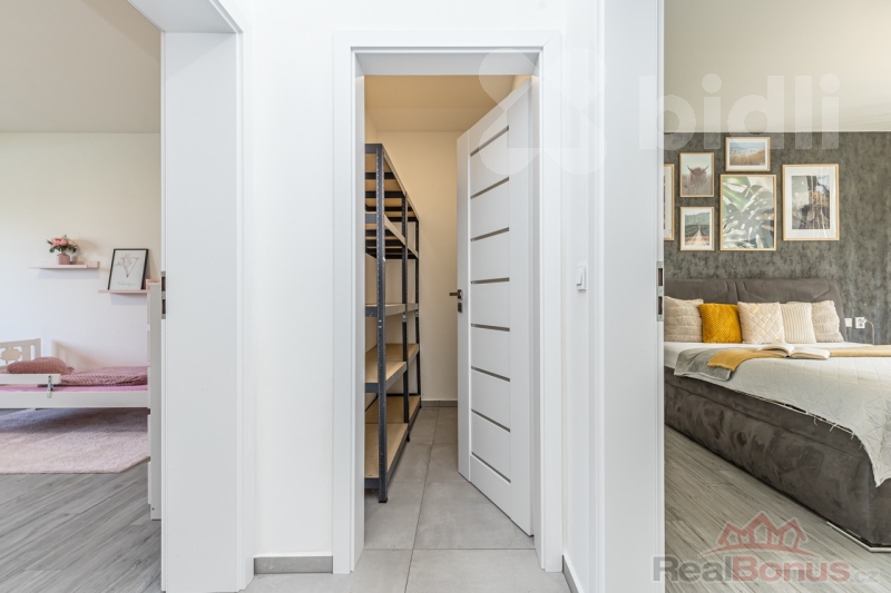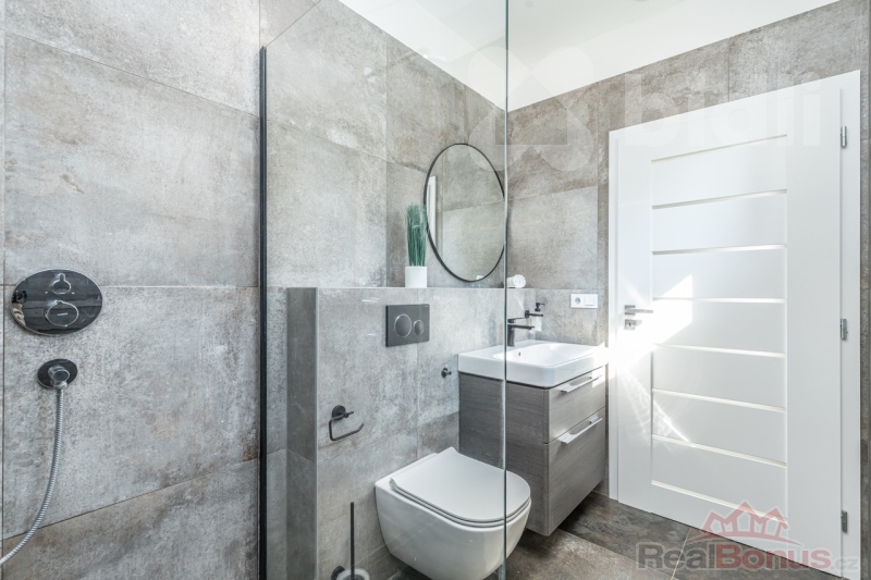 Dům má celkem dvě koupelny s toaletou - hlavní ložnice disponuje jednou z nich, ale navíc i praktickou šatnou. Třetí toaleta je umístěna v technické místnosti. Koupelny jsou vybaveny kvalitními bateriemi značky Hansgrohe. Dvě další samostatné místnosti slouží jako dětské pokoje, pracovna nebo pokoj pro hosty.