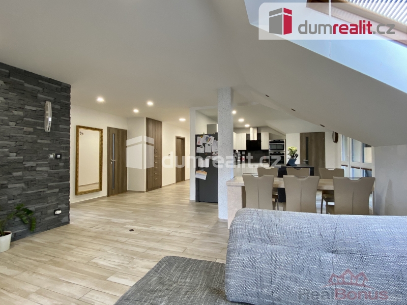 V bytě se nachází kuchyňská linka s varným ostrůvkem se spotřebiči značky AEG (digestoř, sklokeramická deska, vestavěná mikrovlná trouba, horkovzdušná trouba, myčka nádobí). Byt je částečně vybavený s tím, že vybavení je tvořeno krbovými kamny v obývacím pokoji, 2 x vestavěnými skříněmi v ložnici, 1 x vestavěnými skříněmi v obývacím pokoji, 1 x postelí (pokoj), vestavěnými skříněmi v chodbě v 1.NP (u schodiště).