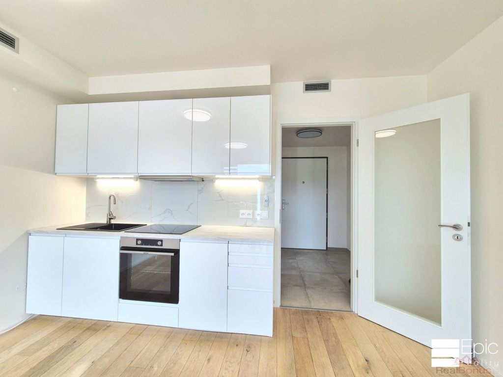 Kuchyňská linka je vybavena vestavěnými spotřebiči, v bytě jsou kvalitní podlahy a koupelna v moderním designu.