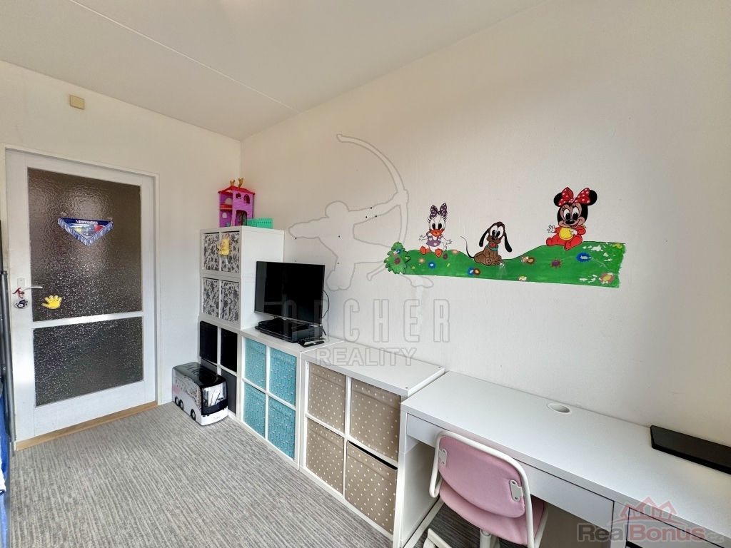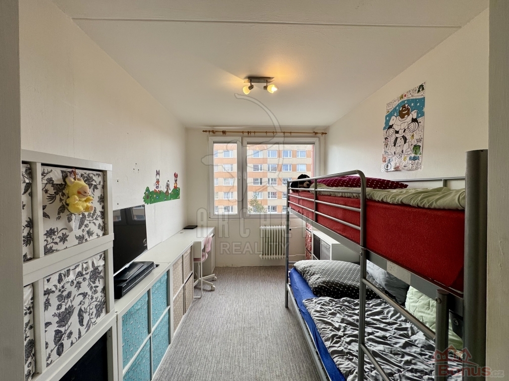 Vedle obývacího pokoje je ložnice vybavená palandou, úložným systémem Ikea a psacím stolem v bílé barvě. Pokoje jsou prosvětlené ze západní strany velkými plastovými okny s dvojskly.
