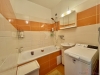 Z předsíně je vchod do koupelny vybavené vanou a umyvadlem s prostorem pro umístění pračky. Vedle koupelny je samostatná toaleta. Vše je ve zděném jádru. Na podlaze v předsíni, v obývacím pokoji a kuchyňském koutě je lino. V ložnici šedý koberec a v koupelně a na toaletě dlažba.