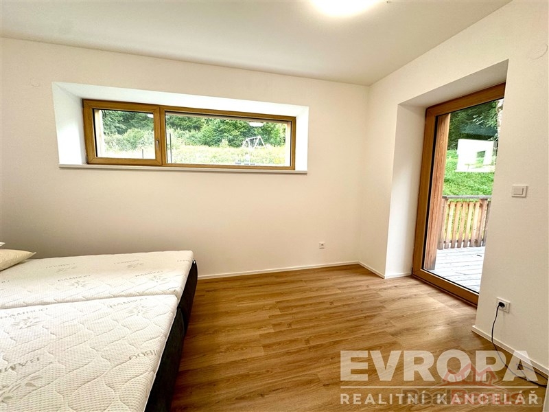 Apartmán nabízí prostorný, světlý obývací pokoj s plynulým přechodem do romantické terasy s výhledem do přírody, jídelní kout, samostatné ložnice, koupelnu, samostatné WC a praktické prostory v chodbách připravené pro vestavěné skříně a technické zázemí bytu. K dispozici je parkovací stání u domu a kóje pro uložení lyží nebo kol.