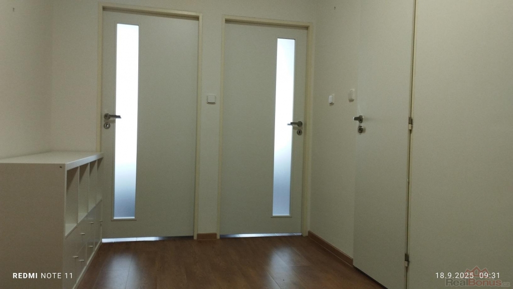 Dispozice: vstupní chodba s vestavnými skříněmi, koupelna s vanou a přípojkou na pračku, samostatné WC, samostatné vstupy do ložnice a obývacího pokoje s kuchyňským koutem s plně vybavenou kuchyňskou linkou: myčka, mikrovlnná trouba, elektrická trouba se sklokeramickou deskou, odsavač par, lednice s mrazákem. Z obývacího pokoje je vstup na balkon s výhledem na jižní stranu do zahrad RD.