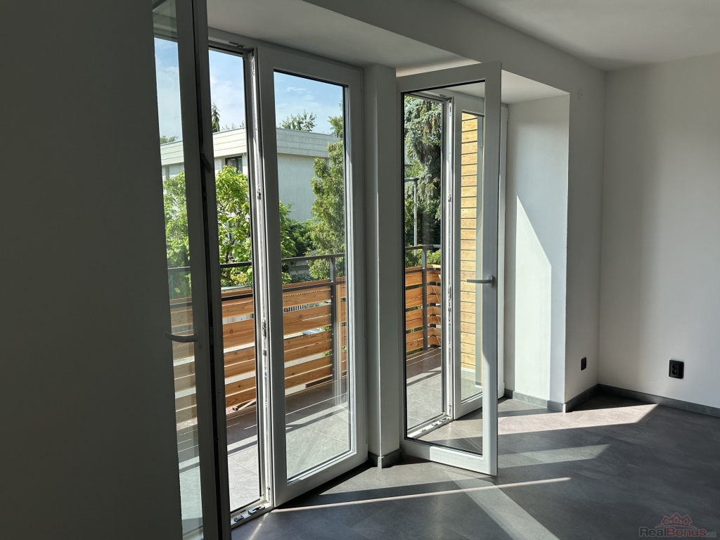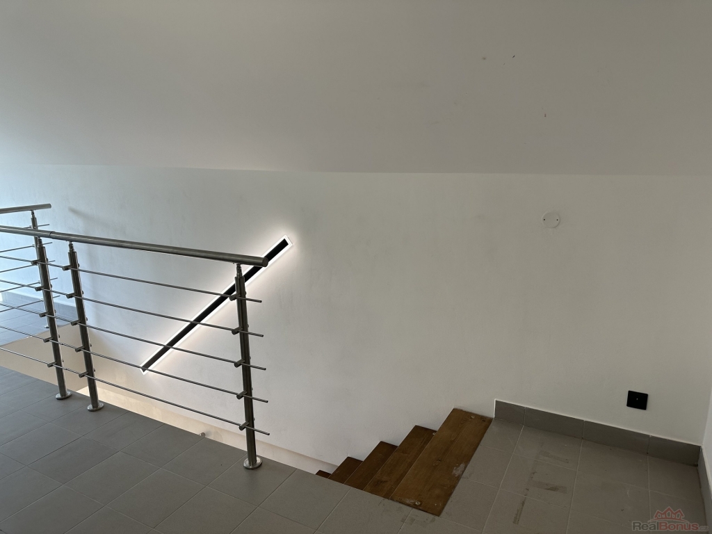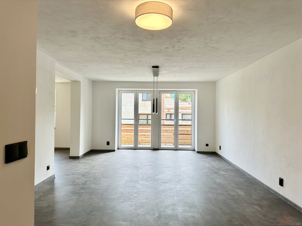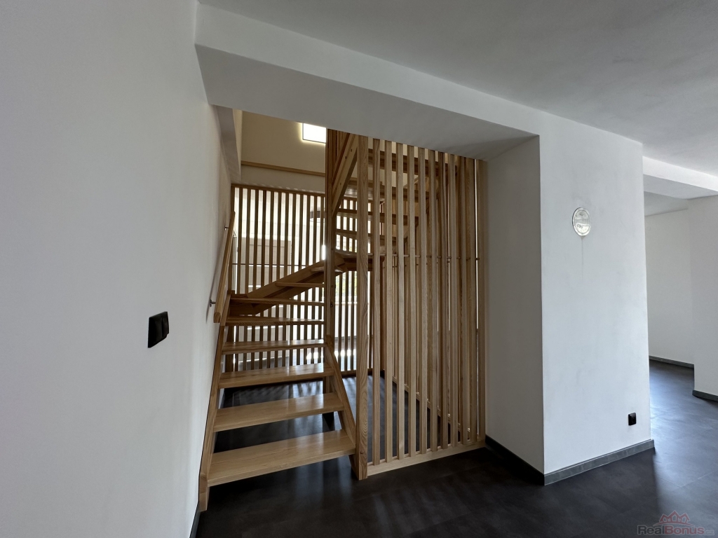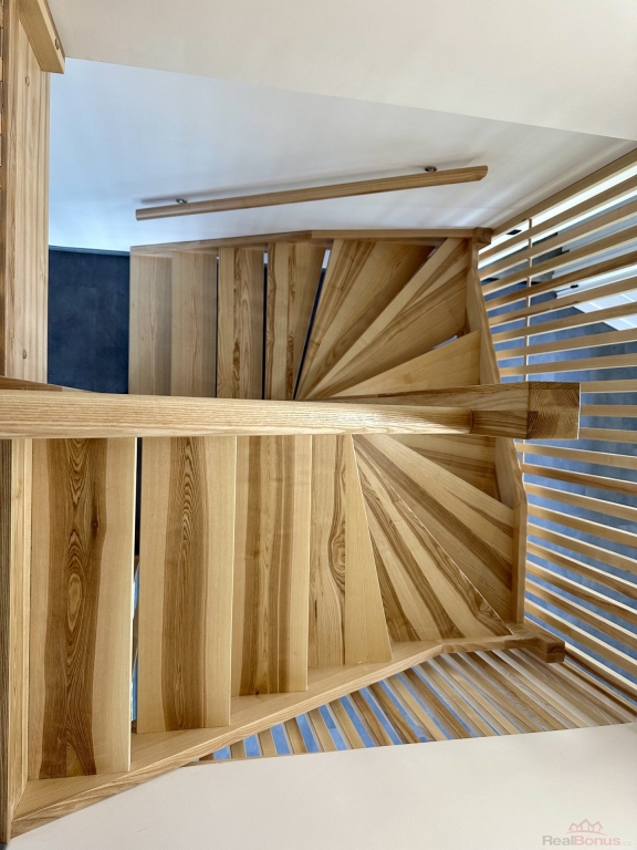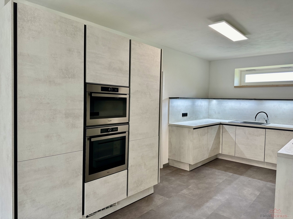 Bytová jednotka má samostatný vstup do domu. V přízemí se nachází vstupní prostor 15m2 s dostatkem úložného místa (např. i kočárku, kola, motorky, apod..), do obytné části v 2.NP vede prostorné schodiště s předsíňovou částí 16m2, která je oddělená dveřmi za kterými se nachází prostorný obývací pokoj s kuch. koutem 71m2, balkon, komora s pračkou Siemens a sušičkou Bosch, ložnice 17m2 koupelna s vanou i sprchovým koutem, samostatné WC. Nová kuchyňská linka je vybavena vestavnými spotřebiči (indukční varná deska, horkovzdušná. el. trouba s grilem, mikrovlná trouba, lednice s mrazákem, digestoř vše Whirlpool)