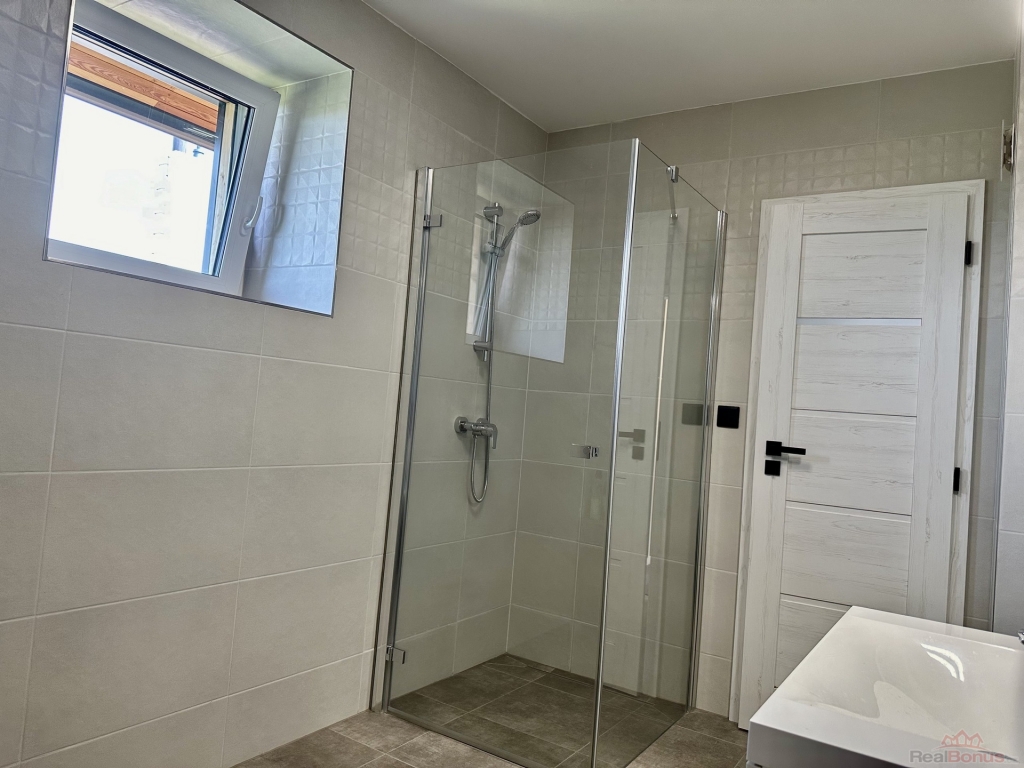 V podkroví jsou další dva pokoje 10 a 20m2 koupelna se sprchovým koutem a toaletou. Do podkrovního patra je přístup po bezpečném, dostatečně prostorném dřevěném schodišti.