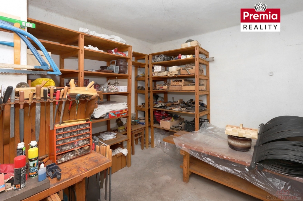 K bytu přísluší 2 sklepy ? jeden menší (4.7 m2) pod schody a druhý velký (16,9 m2) se samostatným vchodem ze zahrady. V současné době je to dílna.