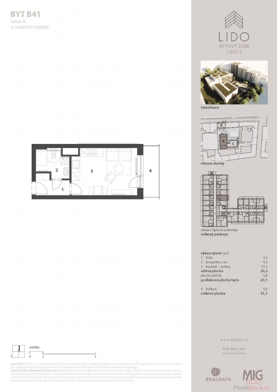 vstupní chodba (3,5 m2), obývací pokoj s kuchyňským koutem (17,5 m2), koupelna s WC (4,3 m2), balkon (4,6 m2)