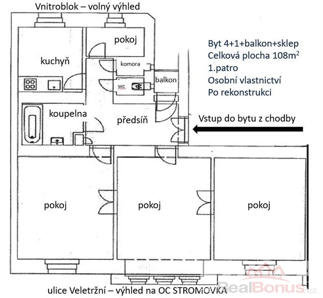 Exkluzivně nabízíme prodej světlého luxusního bytu 4+1 v prvorepublikovém domě ve Veletržní ulici, Praha 7. Nevšední byt o celkové užitné ploše 108 m, situovaný v prvním patře činžovního domu z roku 1945 prošel kompletní nákladnou rekonstrukcí před cca 5ti lety s respektováním historických prvků (dvoukřídlé dveře, dubové parkety,..) včetně oken, dveří, obložení, podlah, vytápění včetně těles po bytě, koupelny a sanitárního vybavení. Náklady rekonstrukce byly téměř 3miliony Kč. Byt se prodává včetně vybaveníviz. foto. Koncepce bytu je ideální z prostorné haly vcházíte do téměř všech místností (3 pokoje, koupelna, kuchyň, WC, technická, balkon) byt by umožňoval i vícegenerační bydlení. Byt kromě prostorné haly tvoří 3 velké a 1 malý pokoj, samostatná kompletně vybavená prostorná kuchyň s moderními spotřebiči, koupelna s vanou, sprchovým koutem a novým kotlem, samostatné WC, samostatnou komoru a malý balkon. K bytu náleží i prostorný sklep. Byt má část oken do ulice a část do dvora, je perfektně větratelný a světlý. Parkování pro rezidenty Prahy 7 je umožněno v OC Stromovka za zvýhodněných podmínek.