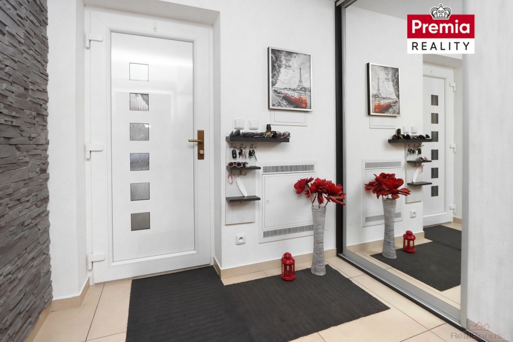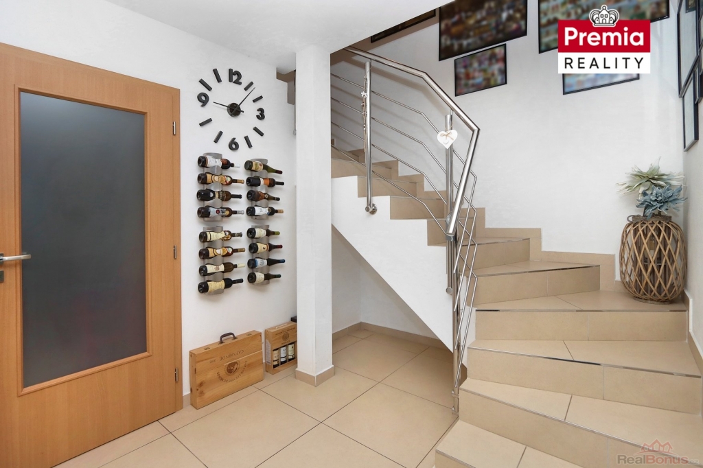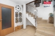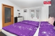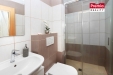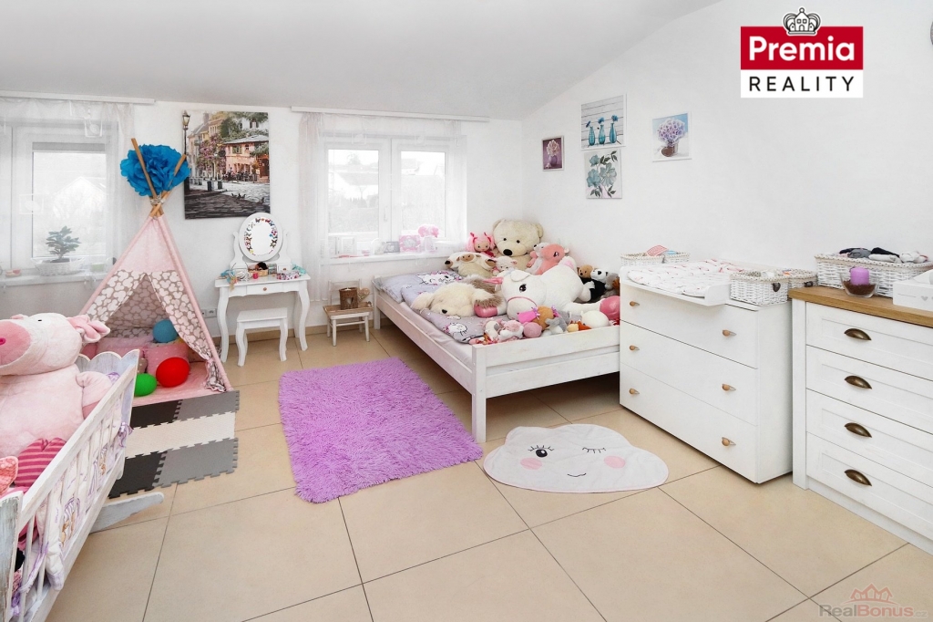 V patře se přes chodbu vchází do prostorného pokoje o výměře 25 m2, jehož rozdělením na dva může vzniknout dispozice domu 5+kk. Z ložnice se vstupuje do šatny, která nabízí dostatek úložného prostoru. Koupelna je osázena masážní vanou, umyvadlem a toaletou. Dům se prodává včetně veškerého nábytku a vybavení, čímž budoucímu majiteli nevzniknou další náklady na zařízení domácnosti.