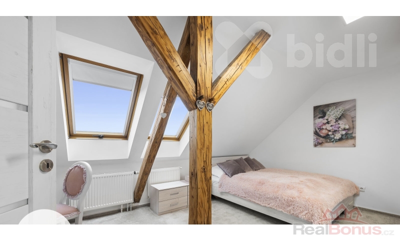 V přízemí se nachází dva samostatné pokoje a v patře prostorný obývací pokoj s kuchyňským koutem a vstupem na terasu, v druhém patře pak dvě ložnice a koupelna. Nechybí technické zázemí ani dostatek úložného prostoru. Na zahradě si užijete klid, soukromí a letní osvěžení v bazénu.