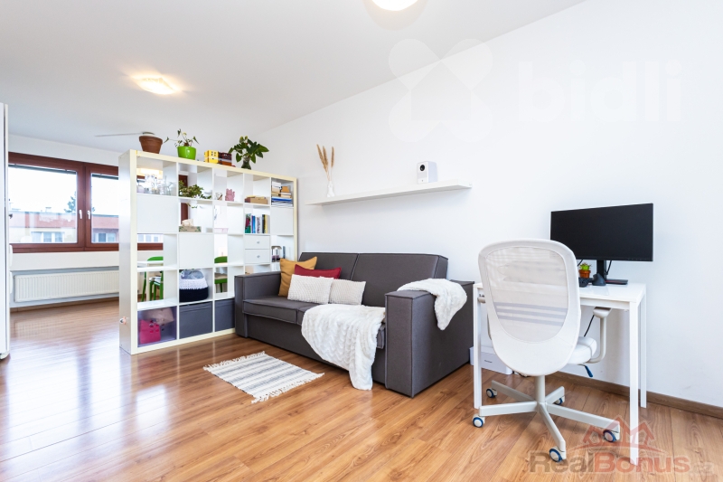 Byt se nachází ve vyšším patře moderního domu s výtahem. Dispozice je prakticky řešená - obývací pokoj s kuchyňským koutem nabízí dostatek prostoru pro posezení, práci i relax. Velká francouzská okna zajišťují dostatek světla po celý den a přímý vstup na terasu, kde si můžete užít ranní kávu nebo klidné večery s výhledem do zeleně i na město. Vybavení je možné zanechat.