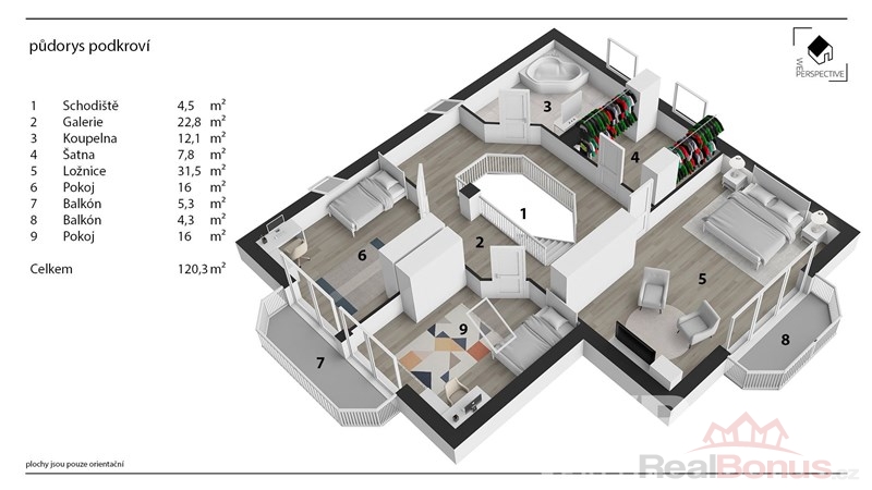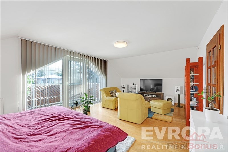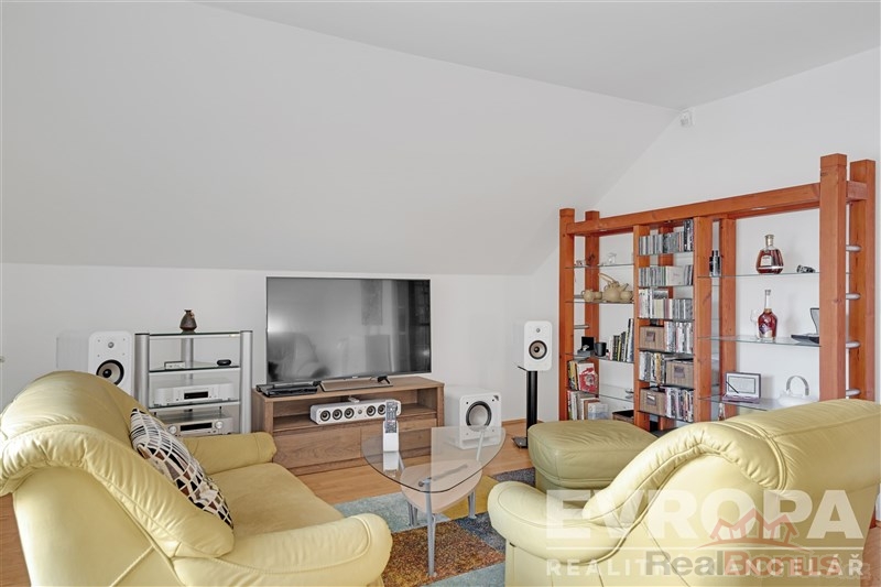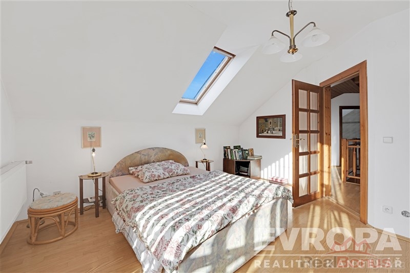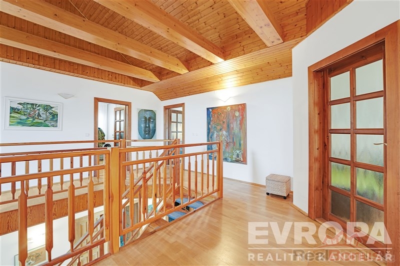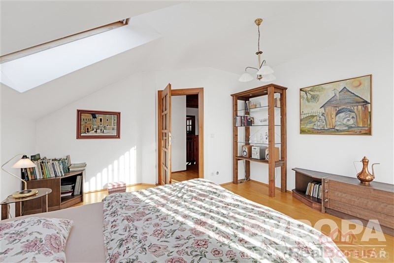 Podkroví nabízí velkou galerie, tři ložnice s balkóny, šatnu a koupelnu s vanou, bidetem a toaletou. Pod střechou jsou praktické půdní prostory pro uskladnění například sezónního oblečení.