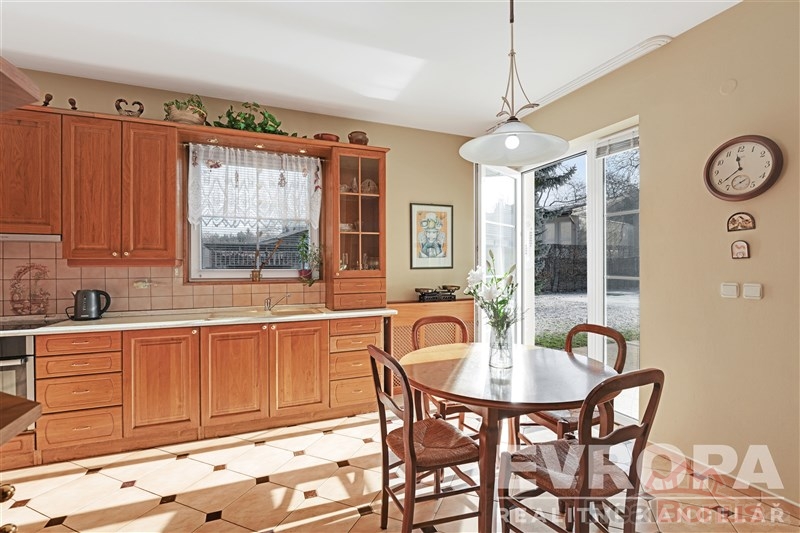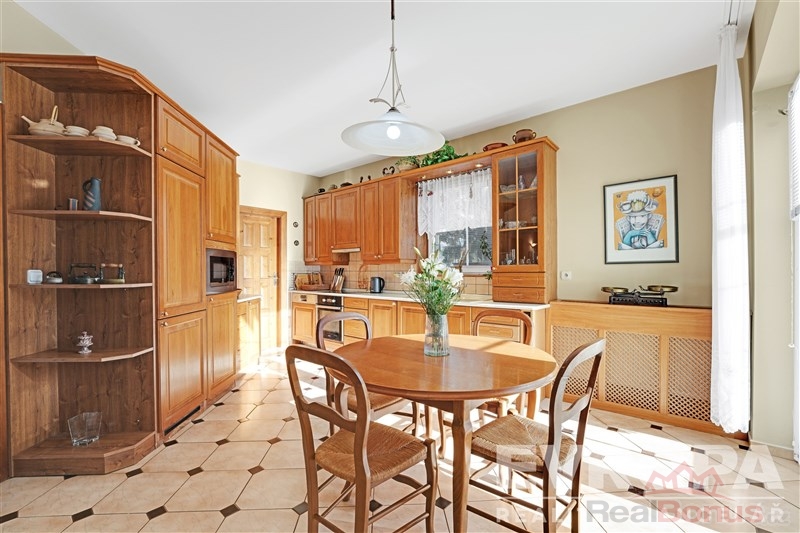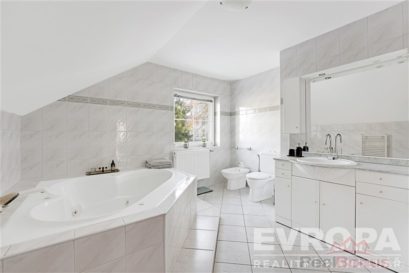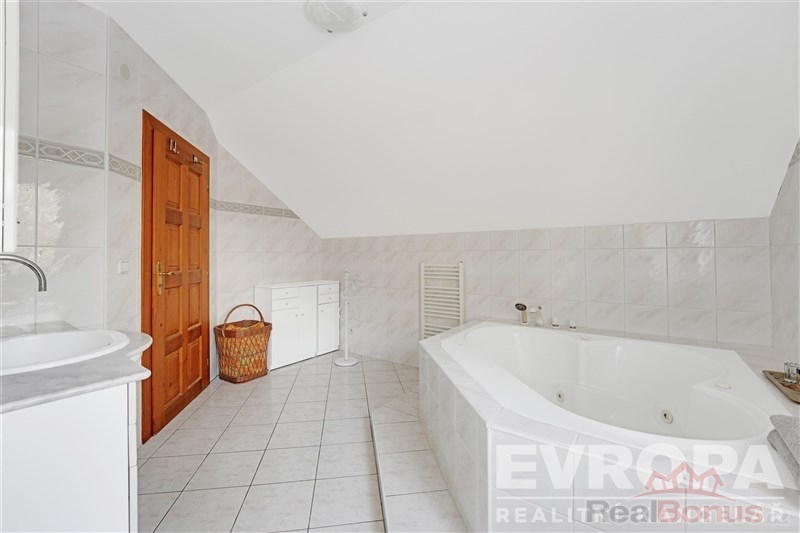 Cihlový rodinný dům se prodává kompletně vybavený a jeho celková podlahová plocha je 350 m2 s dispozicí 6+1 se třemi koupelnami, toaletami a domácím wellness.