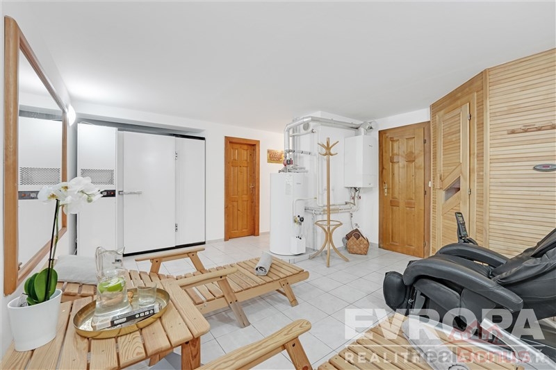 Dominantou suterénu je finská sauna s odpočívárnou, toaletou a sprchovým koutem. Dále se zde nachází velký chladící box, pánem domu a nadšencem do myslivosti, využívaný na zvěřinu, komora a technická místnost.