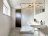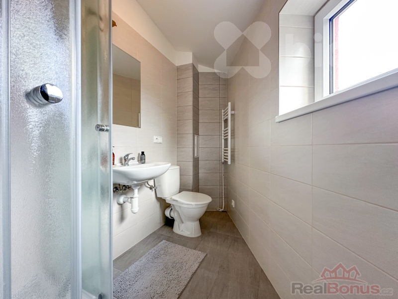 Byt se skládá z pokoje a z koupelny, kde je sprchový kout, umyvadlo, WC a topný žebřík.