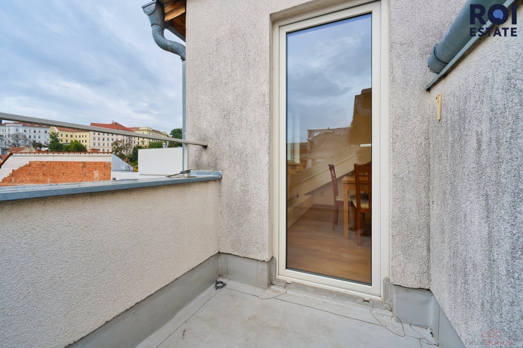 Byt se nachází ve čtvrtém ? podkrovním patře udržovaného domu bez výtahu. Dominantou je okno a terasa s výhledem přímo na Špilberk a Petrov, které vám každý den připomene, že bydlíte opravdu v Brně.