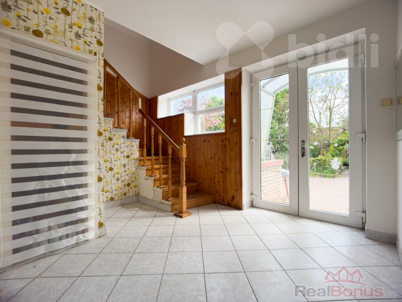 Na prostorné zahradě se nachází zastřešený bazén, altán s houpačkou, zahradní domek a zděná dvougaráž. Ideální místo pro relaxaci i rodinné aktivity.