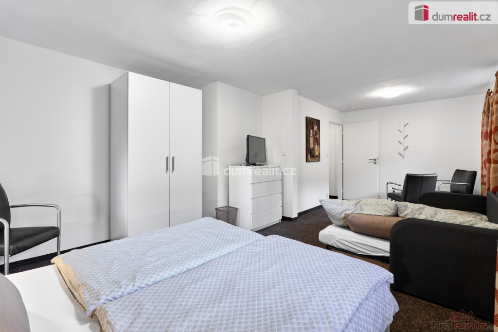 V přízemí domu je společenská místnost a jídelna v jednom, kuchyň, spíž, technická místnost, WC rozdělené na dámské a pánské, 1 samostatný pokoj a 1 pokoj s vlastním sociálním zařízením.