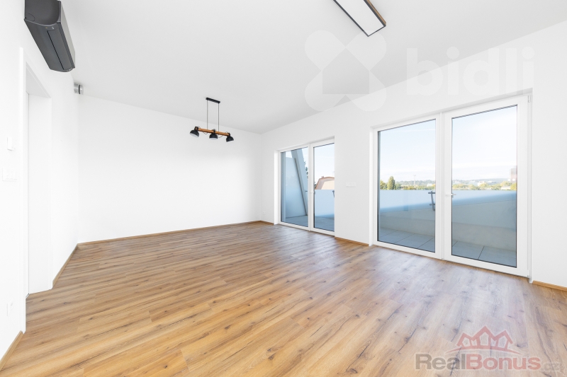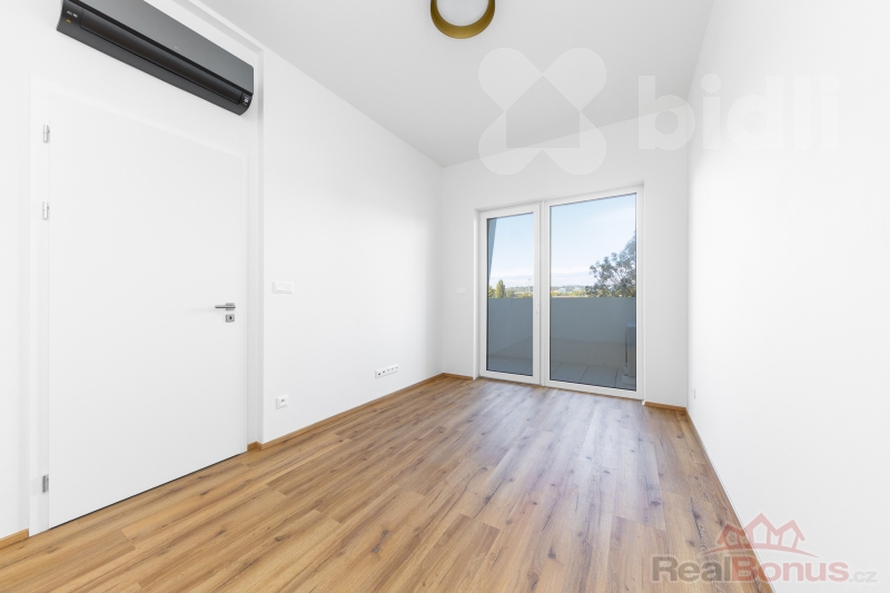 Dispozice bytu: vstupní část s botníkem, samostatná toaleta s umyvadlem, koupelna s walk-in sprchovým koutem, prostorný obývací pokoj s kuchyňským koutem včetně spotřebičů a jídelním stolem se židlemi a samostatná ložnice s šatní skříní. Z obou obytných místností je přímý vstup na prostornou terasu o ploše 16 m2.