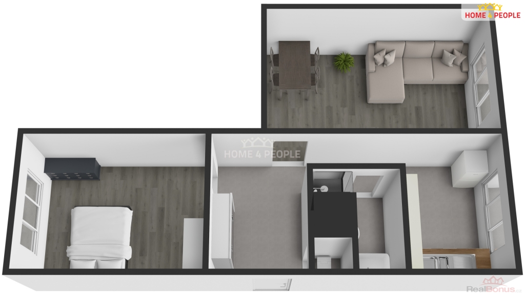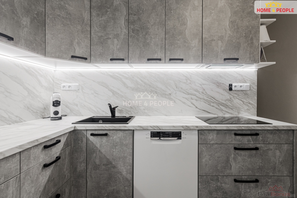 Při vstupu do bytu vejdete do prostorné předsíň (8 m), která spojuje jednotlivé místnosti. Obývací pokoj (20,5 m) nabízí dostatek místa i pro jídelní stůl. Kuchyně (12 m) je vybavená moderní kuchyňskou linkou s vestavěnými spotřebiči. Ložnice (16 m) je orientovaná do klidné části domu. Koupelna se zděným jádrem má jak vanu, tak sprchový kout, toaleta je samostatně.