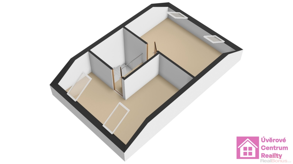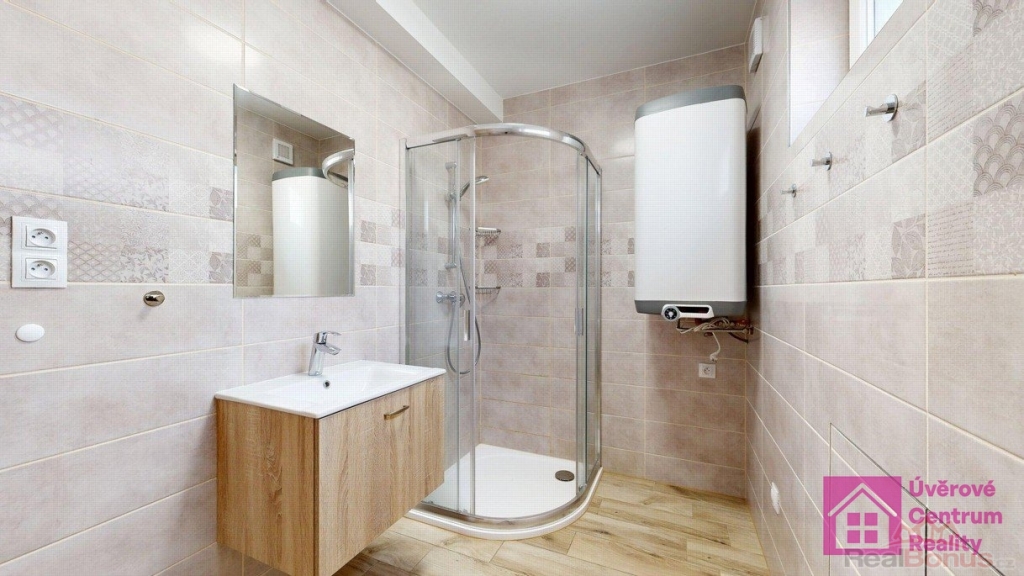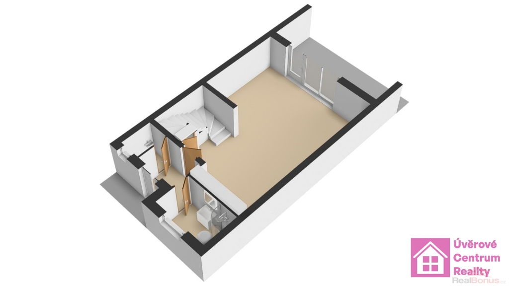 přízemí: předsíň, koupelna (sprchový kout), toaleta, pokoj s kuch. Koutem, schodiště a terasa.