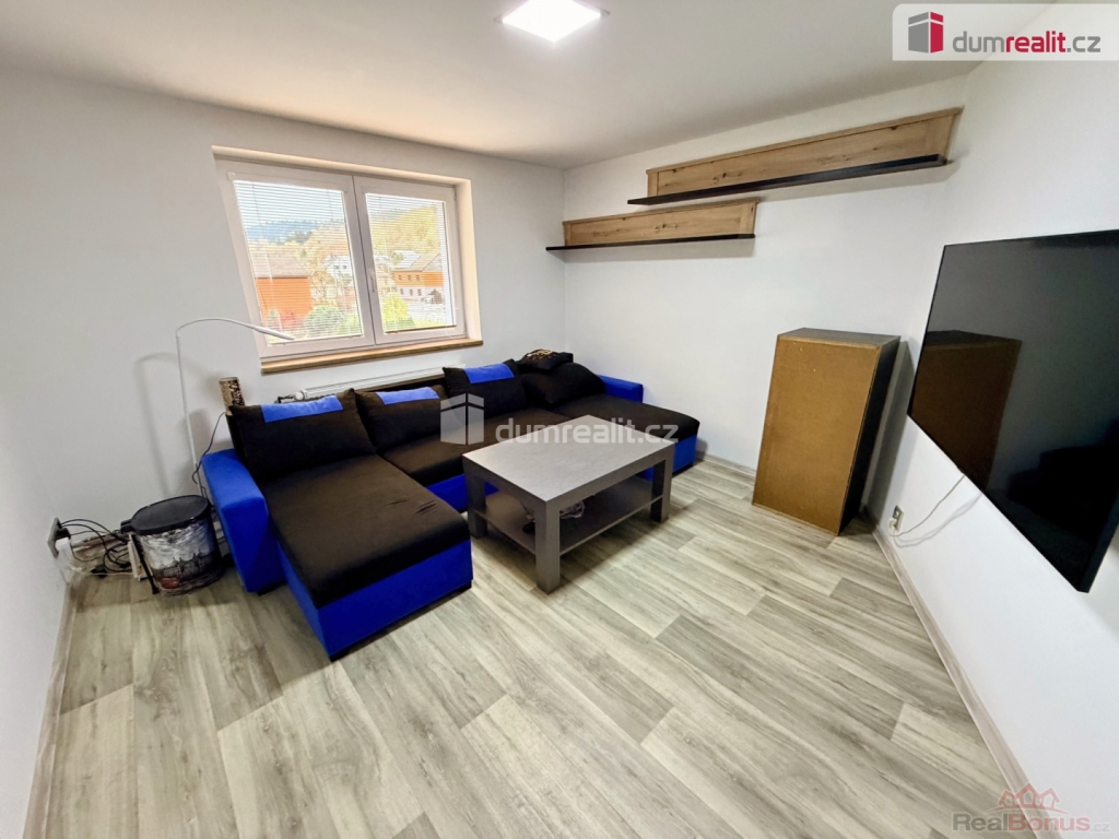V 1. patře domu se nachází velký obytný prostor s kuchyňským koutem, který navazuje na jeden z menších pokojů. Druhý menší pokoj je přístupný samostatně z chodby. Patro doplňuje koupelna.
