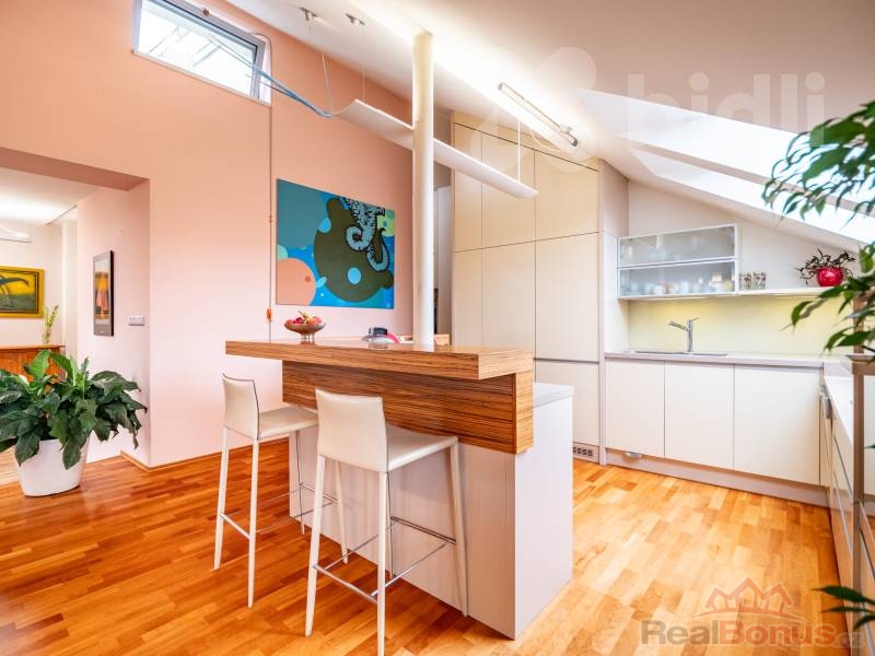 Byt se nachází ve 3. patře a nabízí prostorné uspořádání, které splňuje vysoké nároky na příjemné bydlení. Architektonický návrh od renomovaných tvůrců Patrika Kotase a Hynka Maňáka proměnil původní půdu, rozprostírající se přes čtyři bytové jednotky, v jedinečný a vzdušný prostor.