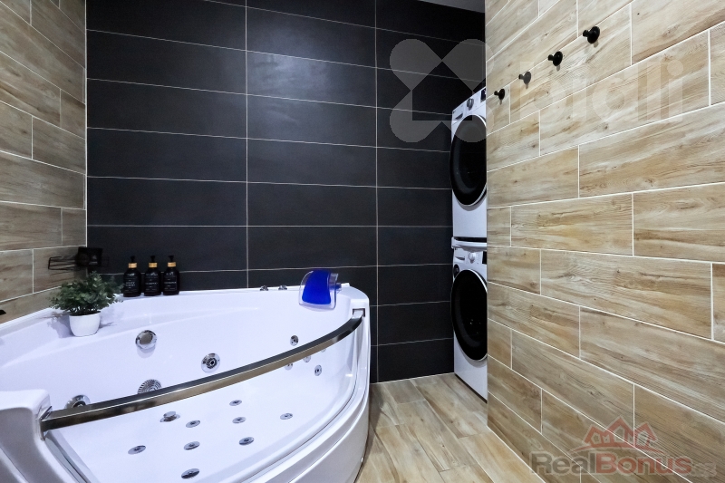 Vpravo se nachází samostatné WC a velkorysá koupelna s vířivkou, místem pro pračku i sušičku.