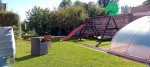 Byt je součástí dvou domků, které vytvářejí útulný dvorek. Cestička lemovaná okrasnými keři vás zavede k blankytnému bazénu. Vedle něj najdete houpačky, klouzačku, pískoviště, trampolínu i pergolu se zahradním posezením, grilem a lednicí ideální místo pro sousedská setkání.
