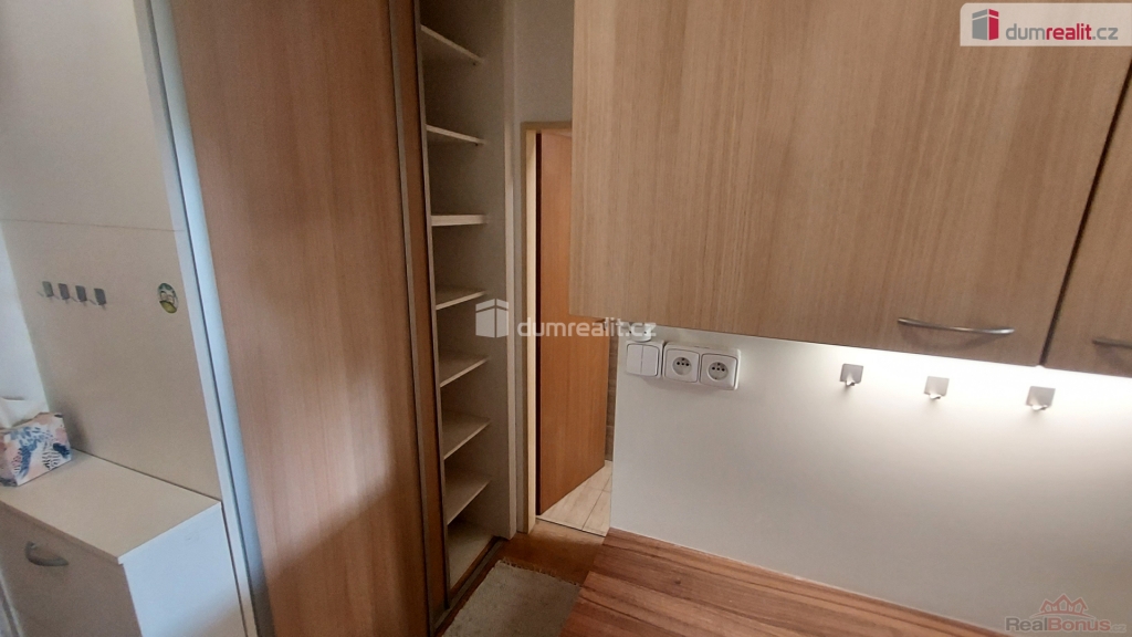 Vstupní prostor z chodby- předsíň má novou odkládací skříň s vestavnou nerez lednicí s mrazákem,  na ni navazuje kuchyň s novou kuchyňskou linkou. Linka má zabudovaný elektrický sporák s troubou, odsavač par, moderní dřez a připravené místo na myčku.