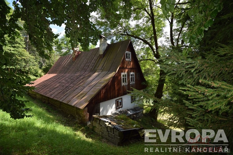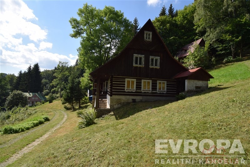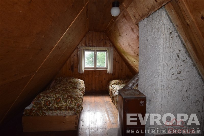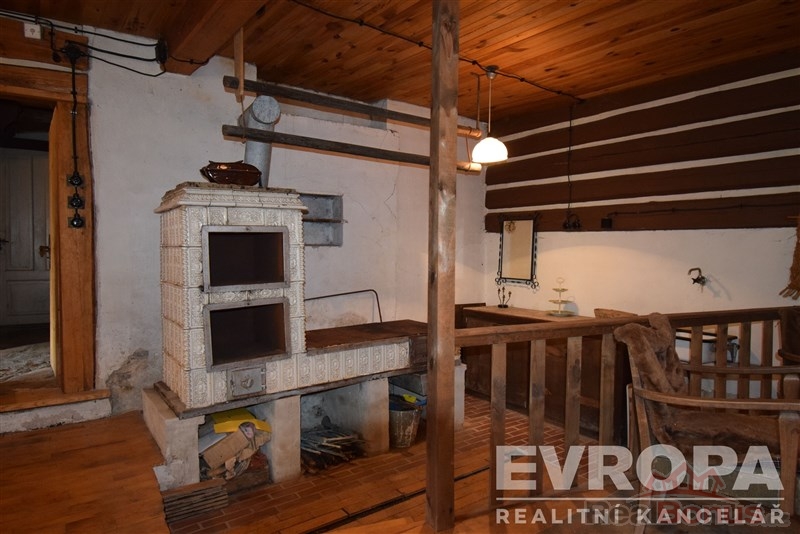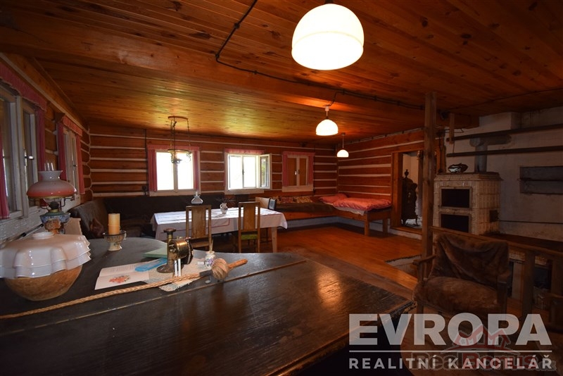 Ve výhradním zastoupení majitele Vám nabízíme roubenou/zděnou chalupu se zastavěnou plochou 150 m2 o dispozici 5+1, postavené na pozemku o výměře 2.585 m2. V přízemí je velká roubená světnice s kachlovými kamny a druhá světnice s kuchyní a koupelnou s WC. V podkrovních částech byly postupně vybudovány tři ložnice ve dvou patrech. Vzhledem k velikosti podkroví je možné vybudování dalšího velkého pokoje nad roubenou částí. Ze stavebního hlediska je statika chalupy bez poškození, dřevěné konstrukce nevykazují napadení škůdci. Opravy a úpravy jsou nutné na elektroinstalaci, komínech a koupelně a celkové modernizaci vzhledem k tomu, že chalupa nebyla posledních deset let užívána.