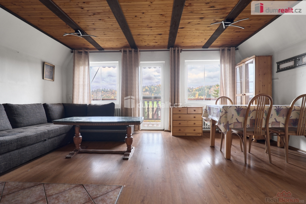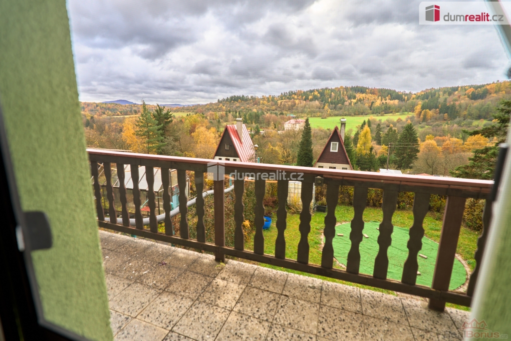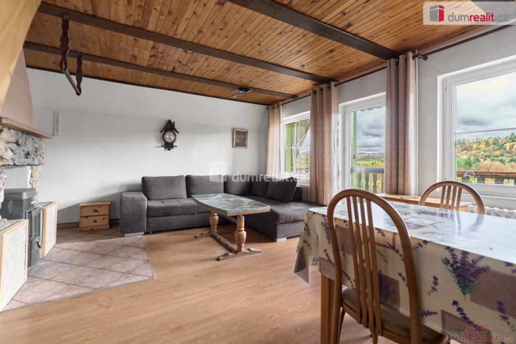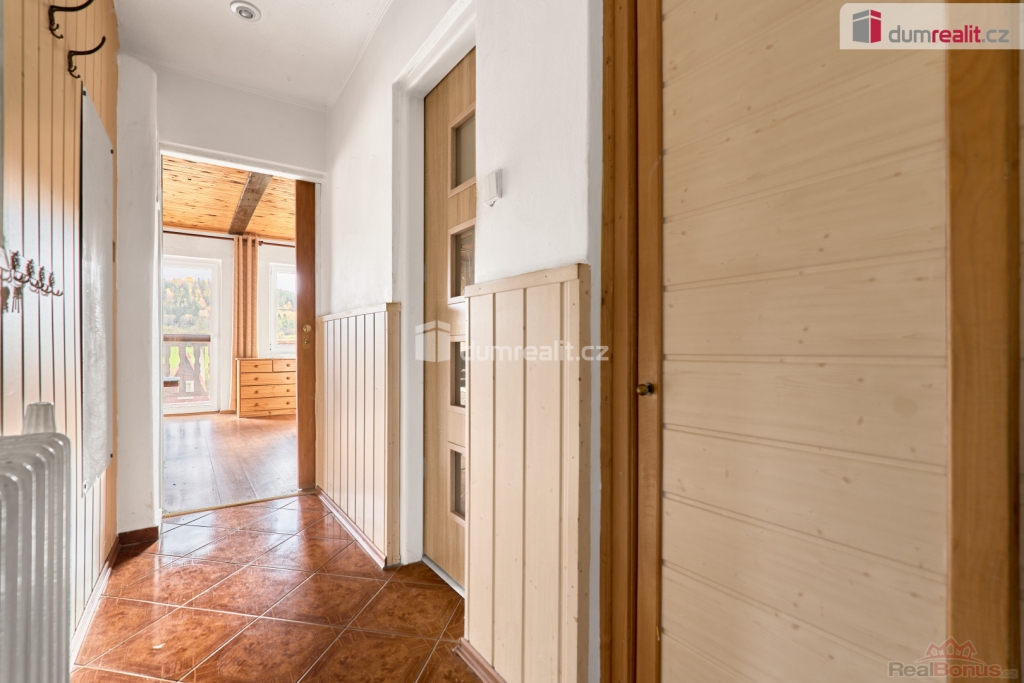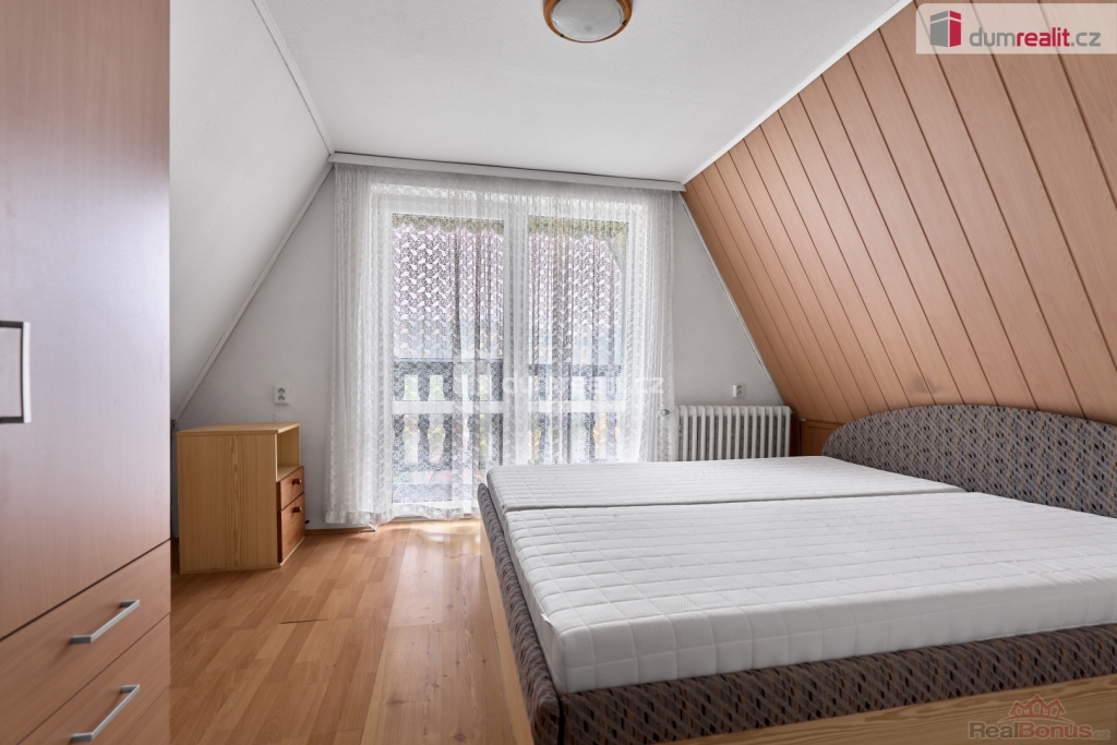 V přízemí chaty se nachází zádveří, vstupní chodba, obývací pokoj s krbovými kamny a vstupem na balkon, kuchyně s kuchyňskou linkou na míru, koupelna se sprchovým koutem a WC, a samozřejmě schodiště. V podkroví se pak nacházejí dva samostatné pokoje a prostorná půda pro uskladnění věcí. Ve sklepě najdete společenskou místnost, dílničku a technickou místnost. Vytápění domu je zajištěno tepelným čerpadlem (3roky) a ohřev vody je zajištěn el. bojlerem (3roky).
