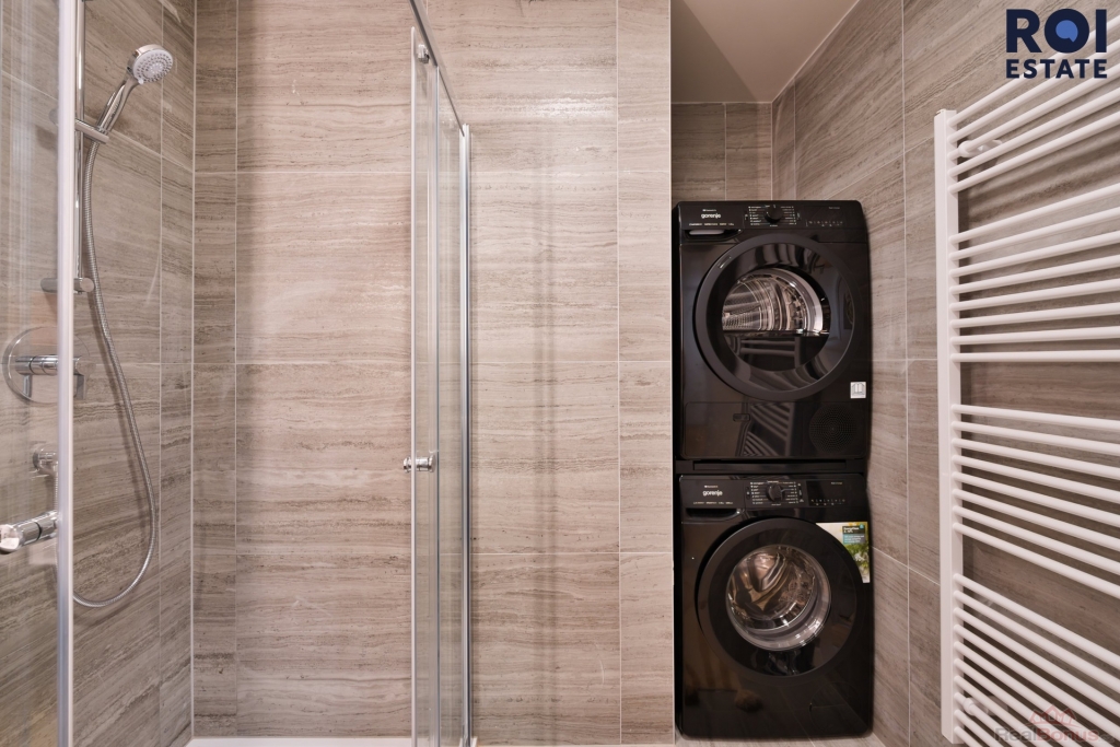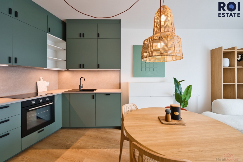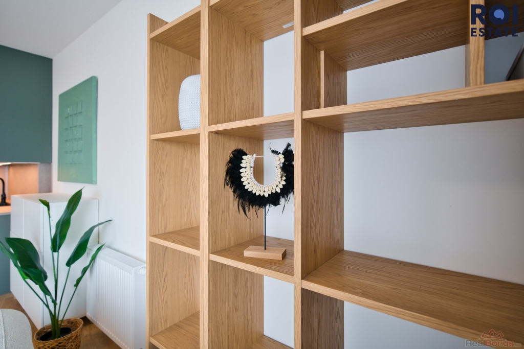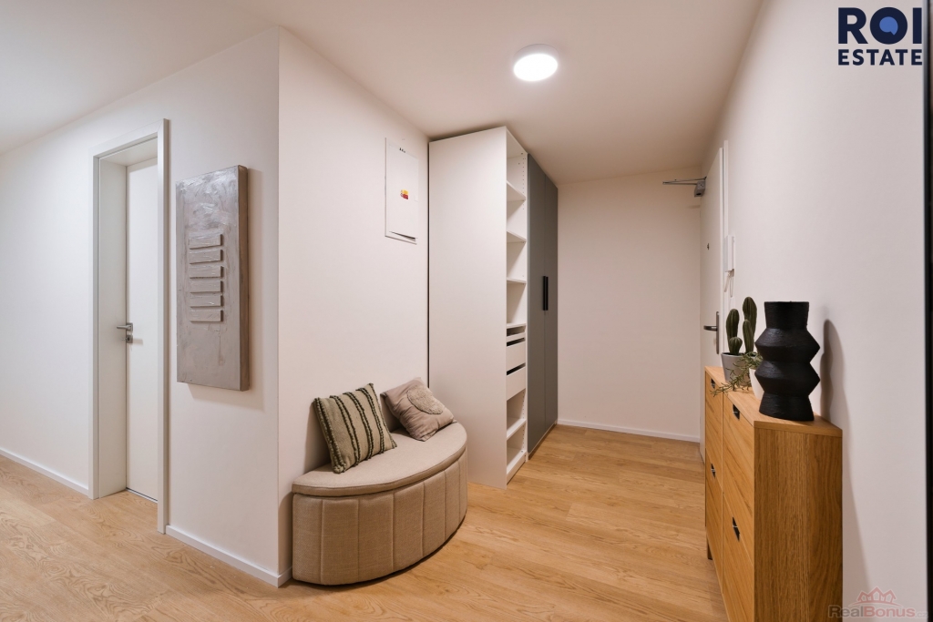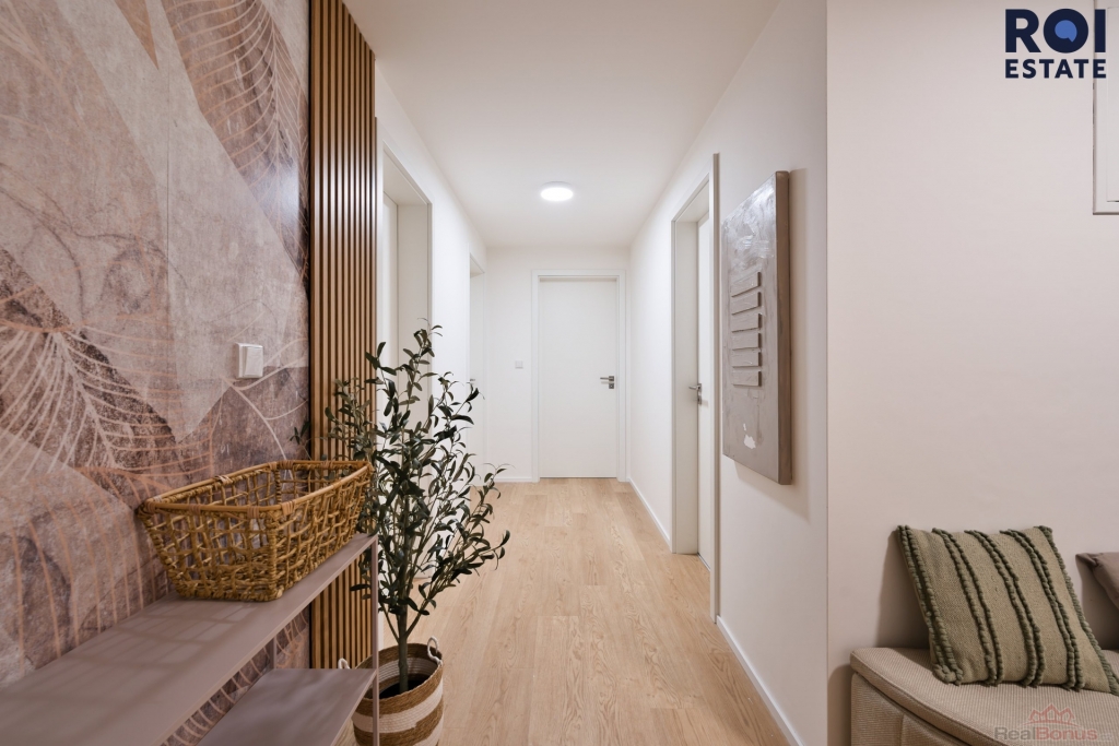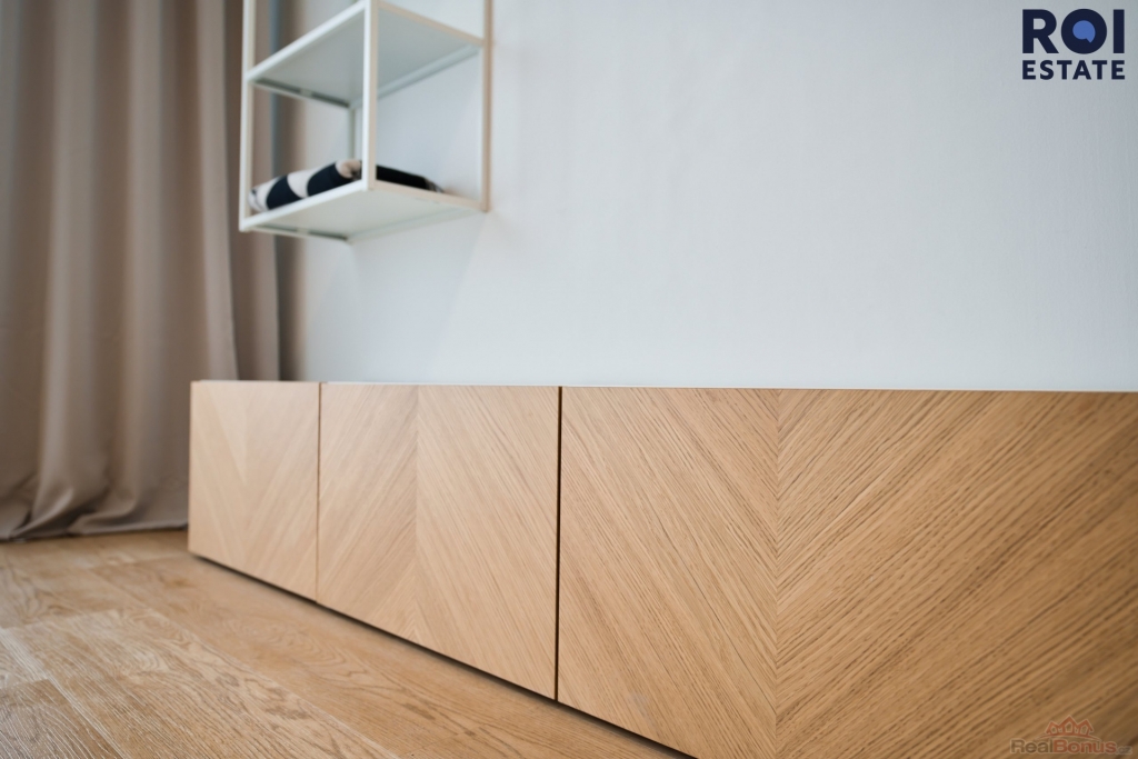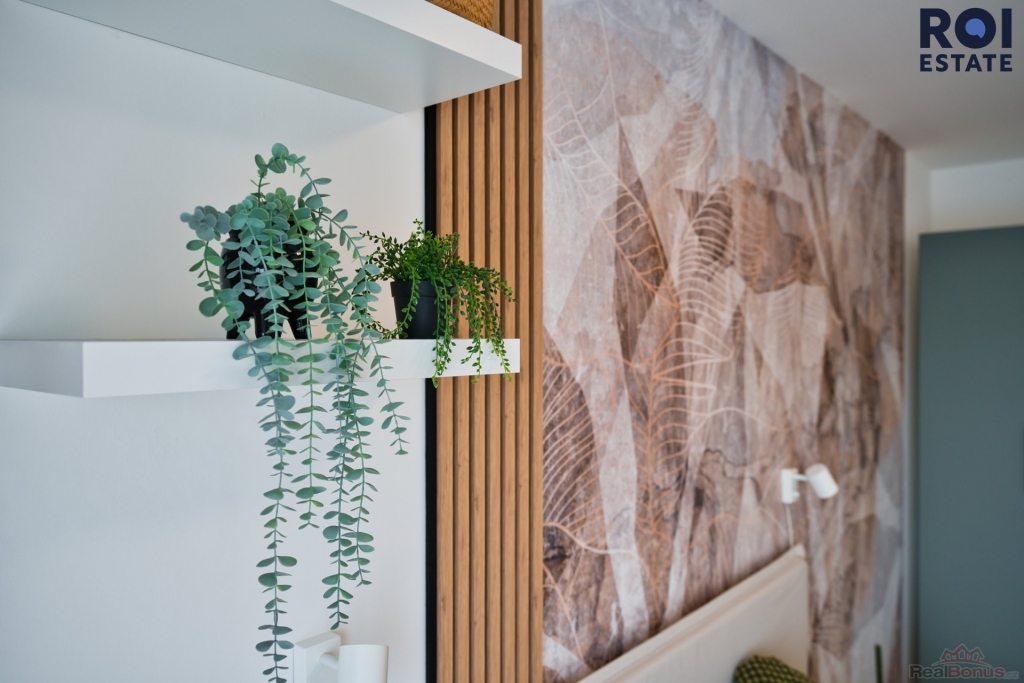 Vybavení bytu: vstupní chodba s úložným prostorem a předsíňovou stěnou, samostatná toaleta, koupelna se sprchovým koutem, pračkou a sušičkou; ložnice s kvalitní postelí, úložnými prostory, šatní skříní a stylovou tapetou; obývací pokoj s moderní kuchyňskou linkou na míru (olivová a cihlová terakota), jídelní kout, světlá sedací souprava, knihovna, stylové osvětlení