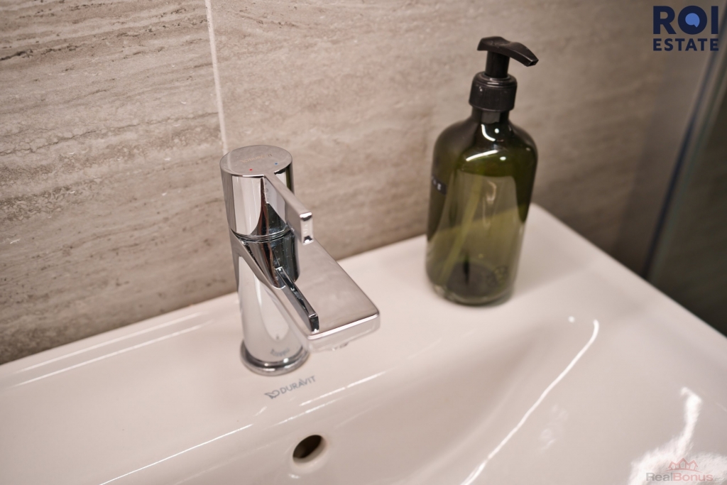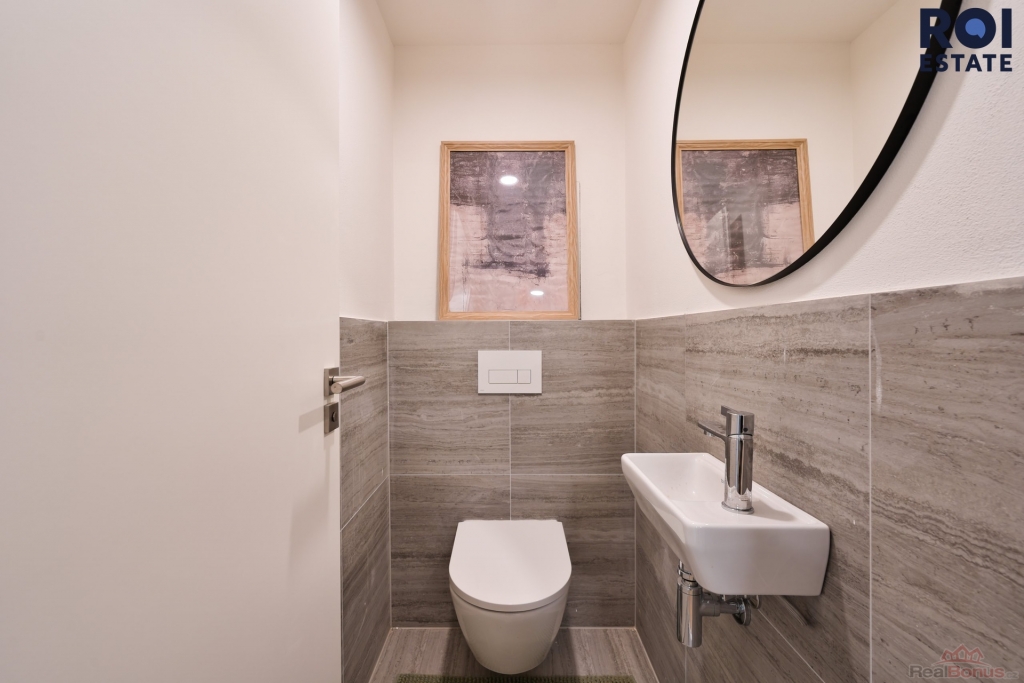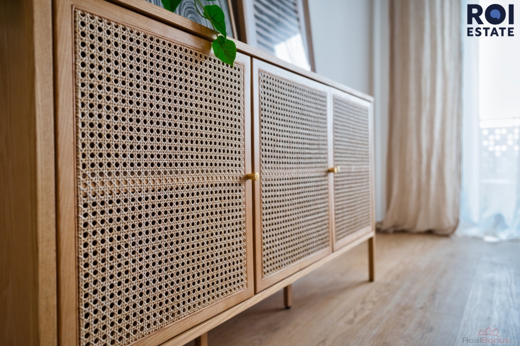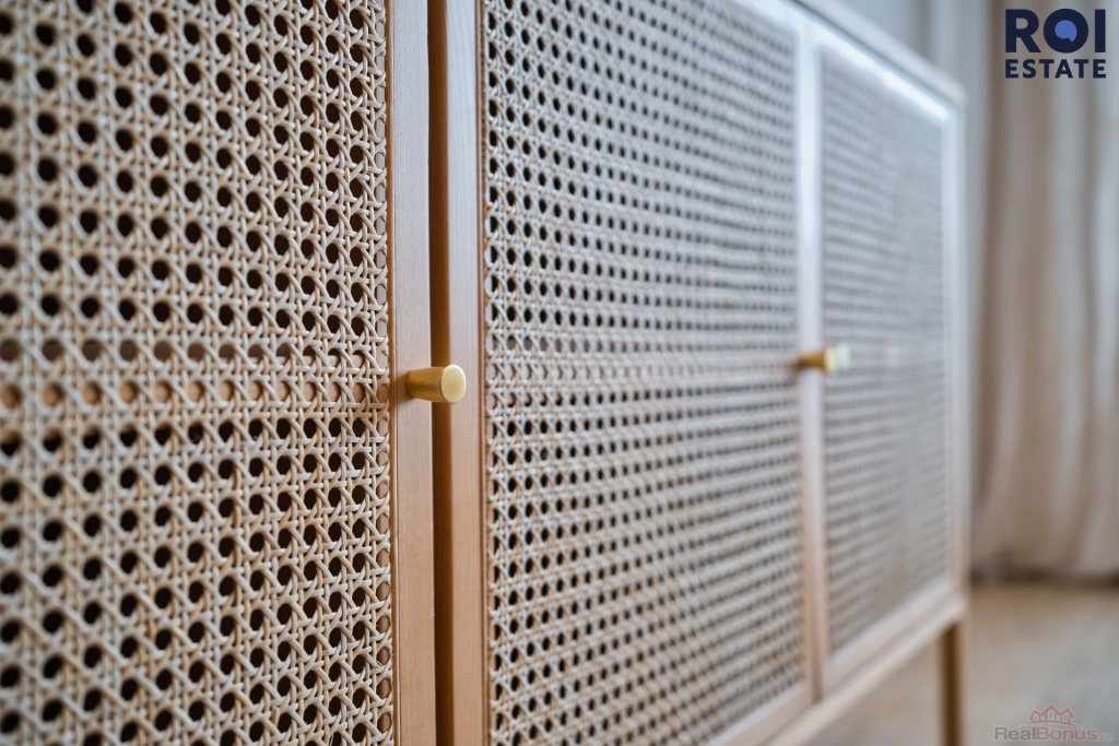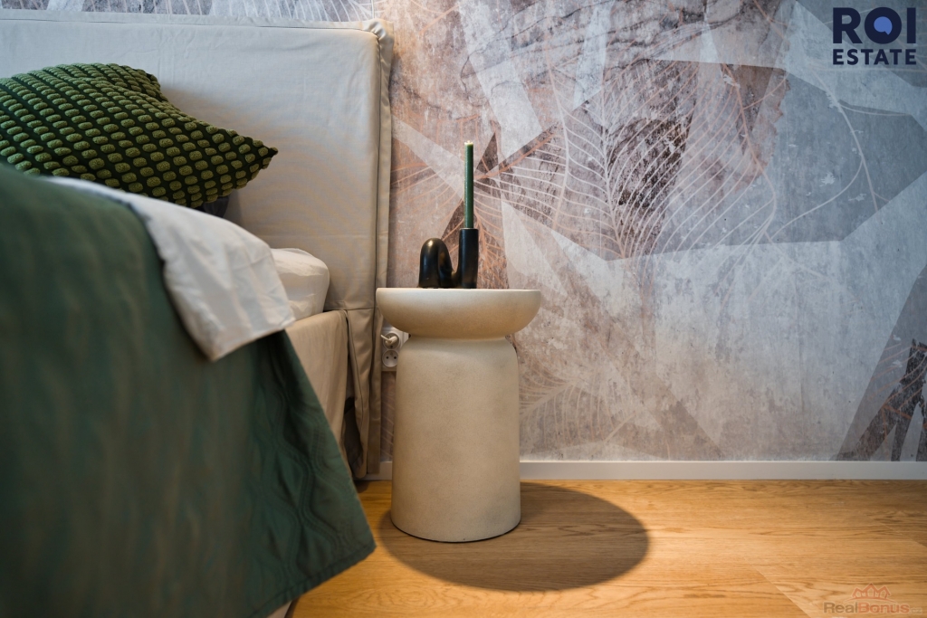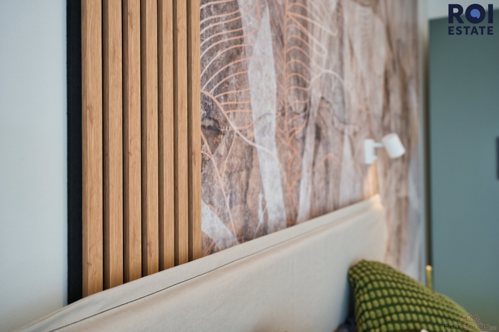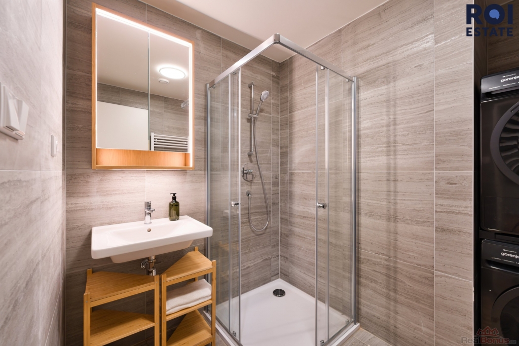 Vybavení bytu: vstupní chodba s úložným prostorem a předsíňovou stěnou, samostatná toaleta, koupelna se sprchovým koutem, pračkou a sušičkou; ložnice s kvalitní postelí, úložnými prostory, šatní skříní a stylovou tapetou; obývací pokoj s moderní kuchyňskou linkou na míru (olivová a cihlová terakota), jídelní kout, světlá sedací souprava, knihovna, stylové osvětlení