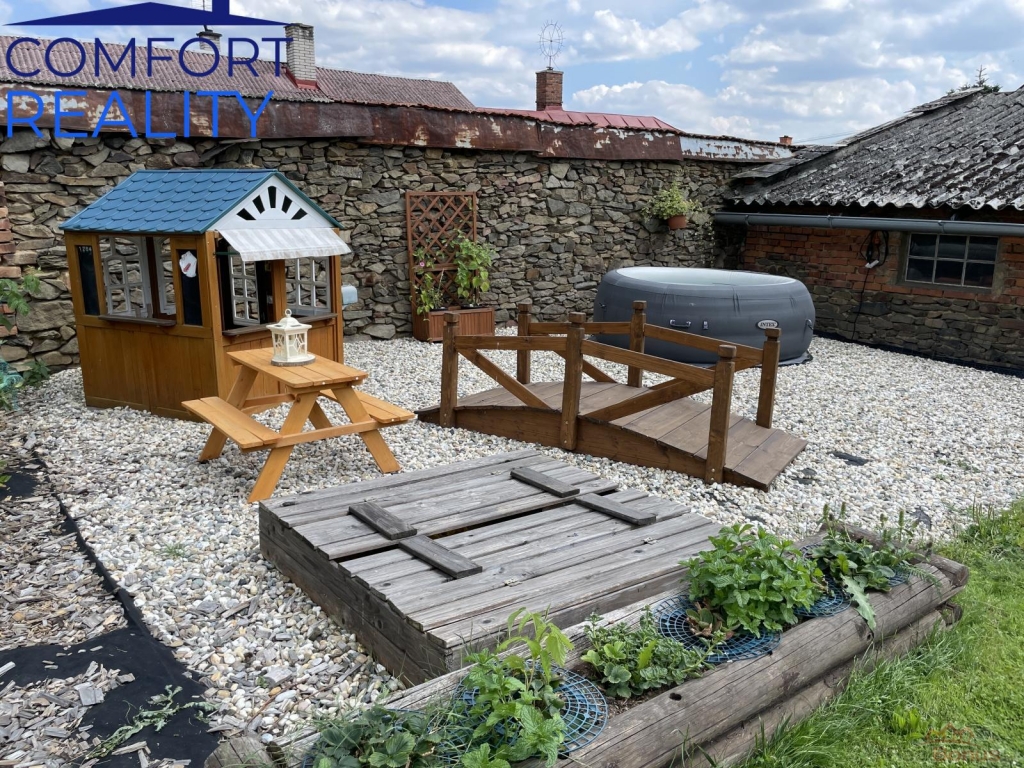 Dům jako samotný je umístěn v klidné části obce ve slepé ulici, náleží k němu rovinatý pozemek o celkové výměře 1499 m2,na kterém je mimo samotný dům ještě umístěna hospodářská budova, která je využívána k uskladnění věcí na zahradu nebo může být zázemím pro chov slepiček apod. Pohodu dokresluje stylová pergola, dětský koutek, vířivka či skleník s vlastní zeleninou. Pozemek je situován do klidové zóny se vzrostlými stromy v okolí, což je zárukou soukromí. Samotný dům je dispozičně řešen jako 3+1 s tím, že menší úpravou lze vytvořit dispozici 4+kk, která je vyhledávána zejména rodinami s dětmi.