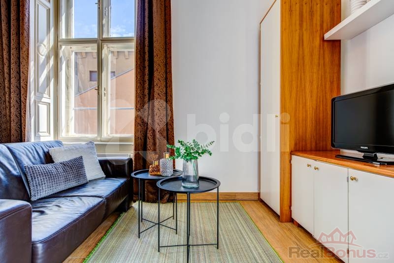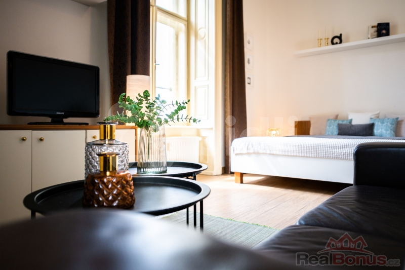 Nabízíme vám zařízený moderní byt v revitalizovaném secesním domě o dispozici 1+1 o celkové ploše 52 m2. Byt se nachází ve 2. nadzemním podlaží, kde je k dispozici výtah. Součástí pronájmu bytu je veškeré vybavení, jako je myčka, pračka, lednice, sklokeramická varná deska, el. trouba s grilem, mikrovlnná trouba, kuchyňský inventář, televize, pracovní stůl s židlí, postel, skříně, jídelní stůl, židle, sedačka. V koupelně je sprchový kout a závěsná toaleta. Byt je orientovaný na jih a východ.