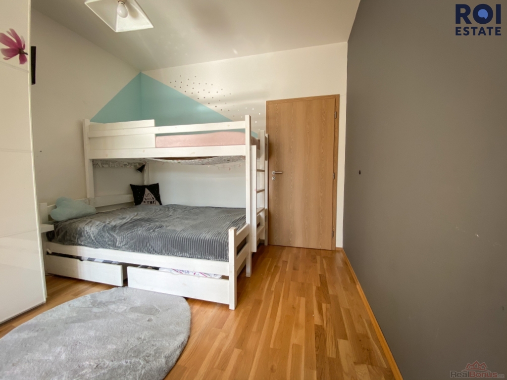 Dále ložnici, která aktuálně slouží jako dětský pokoj (nábytek zde nezůstane) a šatnu pro všechno vaše oblečení.