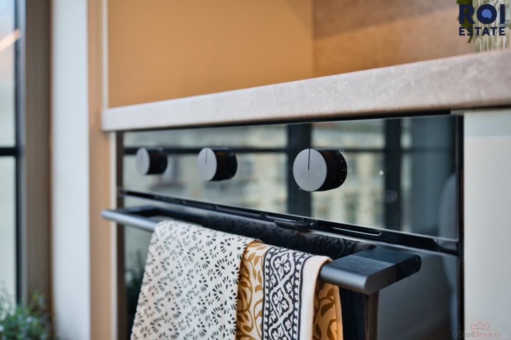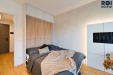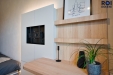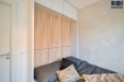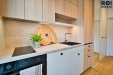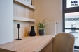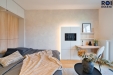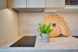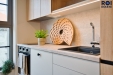 Interiér působí lehce, harmonicky a příjemně teple díky kombinaci přírodního dřeva, světle šedých tónů a jemného ambientního osvětlení. Kuchyňská linka je plně vybavená vestavnými spotřebiči, nechybí indukční varná deska, trouba, digestoř ani chladnička. Promyšlené úložné prostory přirozeně navazují na obytnou zónu s pracovním koutem, který působí elegantně i prakticky zároveň.