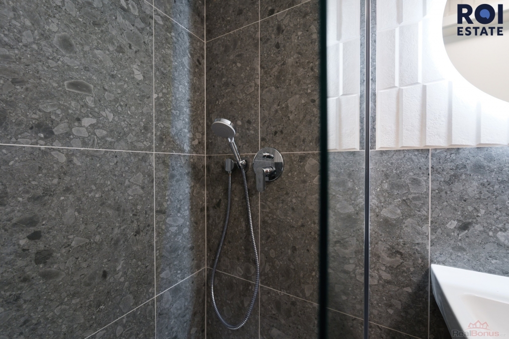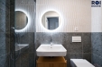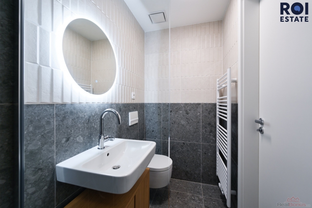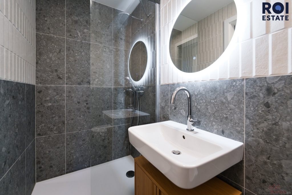 Koupelna vás překvapí svou kvalitou ? obklad v kamenném dekoru, sprchový kout se skleněnou zástěnou, designové kulaté zrcadlo s podsvícením a umývadlo na dřevěné skříňce tvoří příjemnou kombinaci moderního wellness stylu.