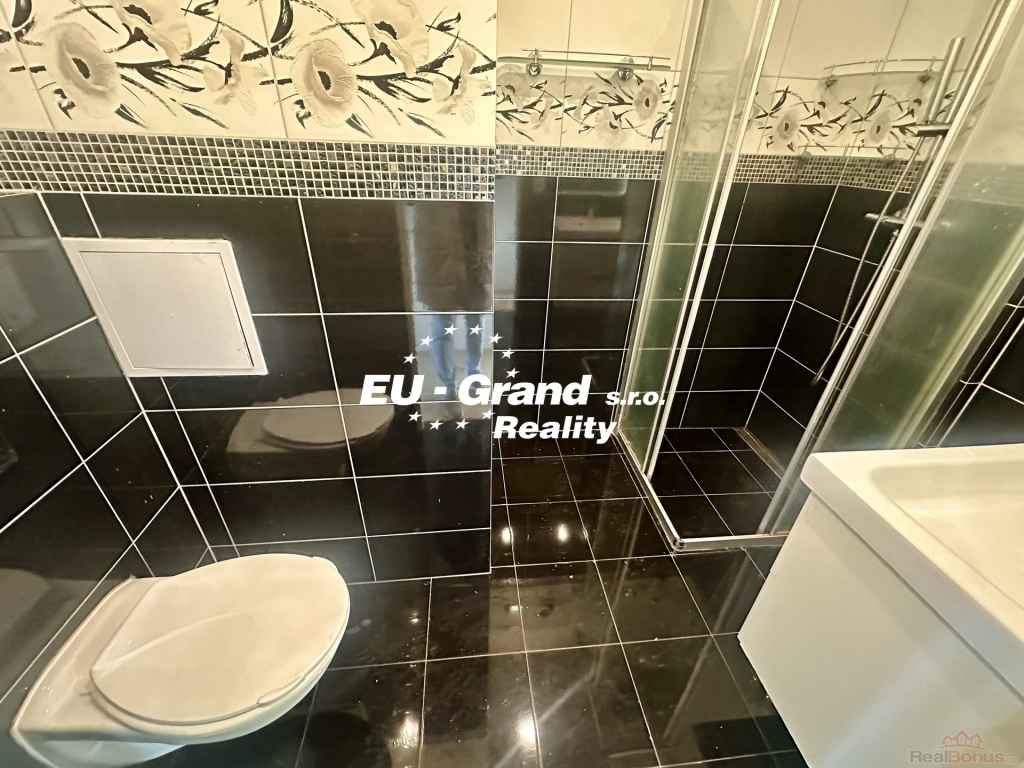 Dominantou bytu je moderní, krásná a prostorná kuchyň v elegantním černo-bílém provedení. Je vybavena vestavnými spotřebiči (trouba, mikrovlnná trouba, varná deska, digestoř), velkorysou pracovní plochou a dostatkem úložného prostoru. Stylový barový pult opticky odděluje kuchyň od obytné části a zároveň poskytuje příjemné místo pro stolování nebo posezení.