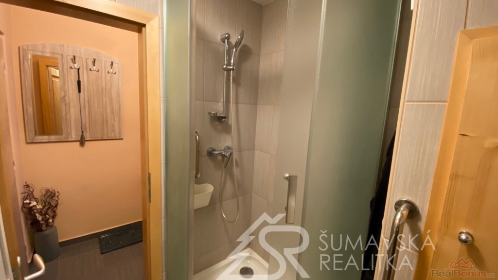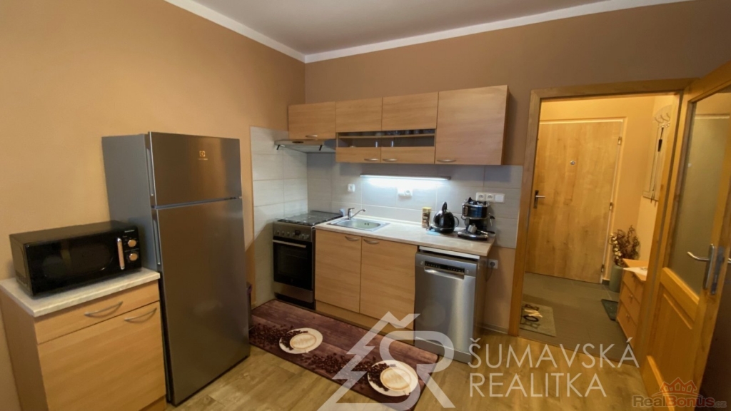 Dispozice bytu: vstupní předsíň, místnost s obývací částí se sedací rozkládací soupravou a jídelní částí s plně vybavenou kuchyní se spotřebiči mikrovlnná trouba, sporák, myčka). Ložnice s dvoulůžkem, skříní, komodou s TV. Koupelna (se sprchovým koutem, umyvadlem a toaletou). Na podlaze je linoleum s dekorem dřeva. Nájemné/měsíc 10.000,-Kč + 3.000,-Kč( služby) + 800,-Kč (elektřina)+ plyn 200,-Kč. Celkem 14.000,-Kč. Vratná kauce 20.000,-Kč. Provize RK 10.000,-Kč