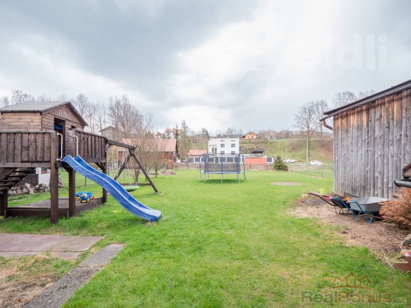 Na zahradě se nachází zděná hospodářská budova, garáž a dřevěný domek se skluzavkou pro děti.