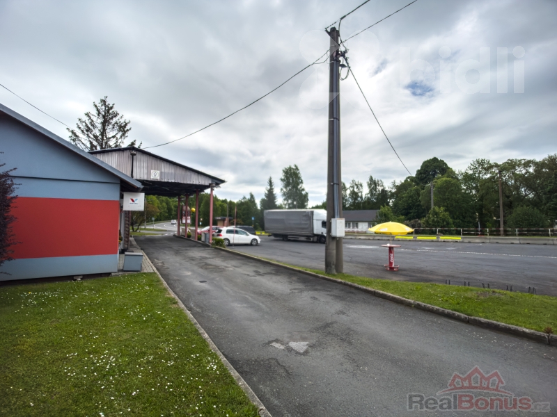 stánek čerpací stanice, nádrž na pohonné hmoty umístěná na pozemku, venkovní posezení pro zákazníky, rozlehlé příjezdové a parkovací plochy vhodné pro osobní vozy, motocykly i nákladní dopravu.