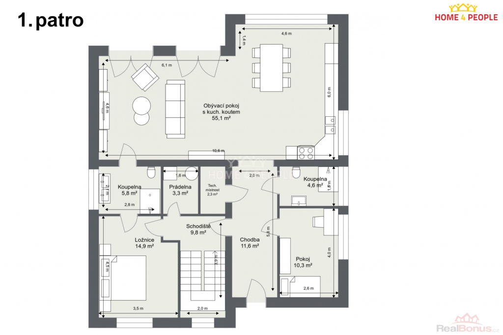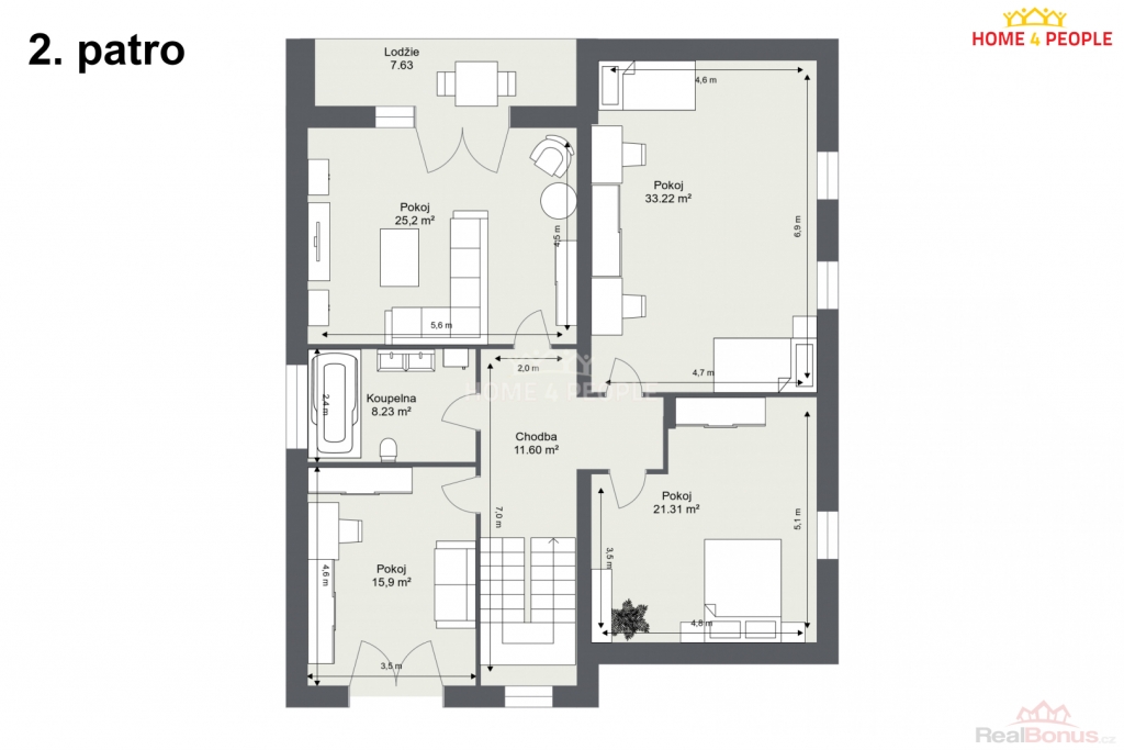 V 1.NP jsou 4 pokoje: pokoj 1(15,93 m),pokoj 2(25,20m),pokoj 3(33,22m),pokoj 4(21,31m) se vstupem na balkón (7,63m) ,prostorná chodba (16,45m)a velká koupelna s vanou.