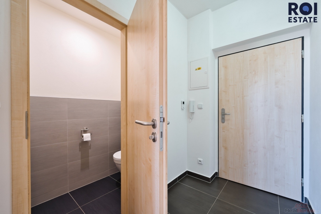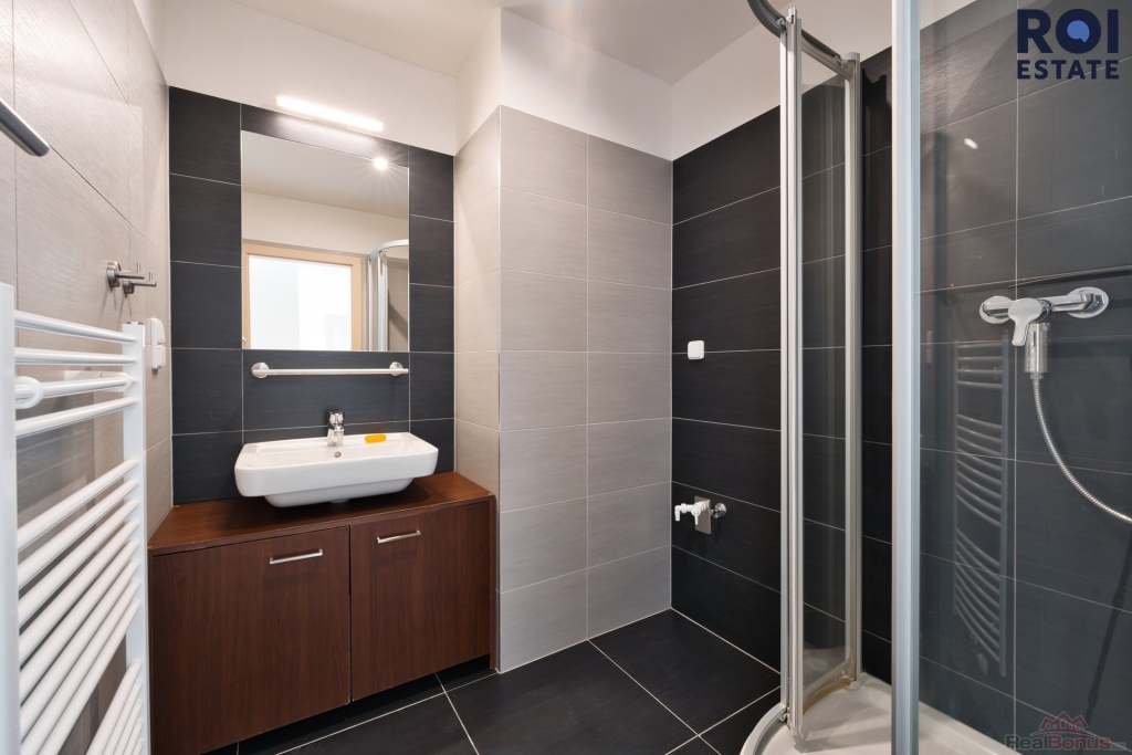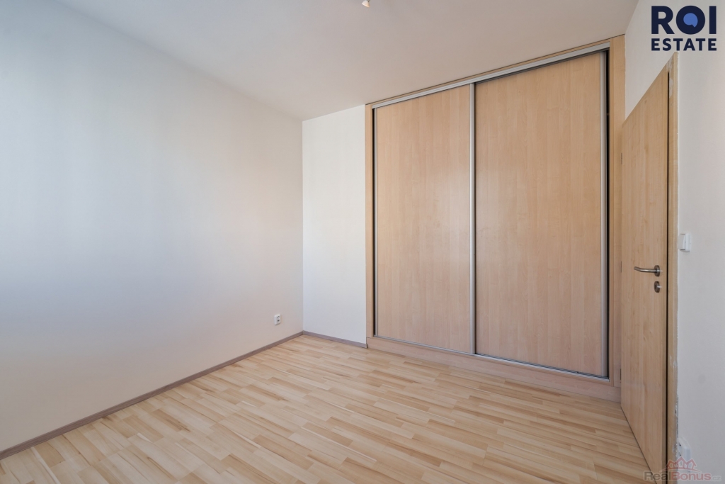 Ložnice je samostatná a nabízí velkou vestavěnou skříň s dostatkem úložného prostoru. Koupelna je řešena v moderním stylu v odstínech šedé a černé, se sprchovým koutem a praktickou umyvadlovou skříňkou. Toaleta je oddělená.