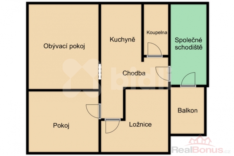 Byt zahrnuje obývací pokoj, ložnici, pokoj, kuchyni s jídelnou, chodbu a koupelnu. Výměra bytu s balkonem činí cca 81 m2. K bytu patří garáž v zahradě o výměře 22 m2.