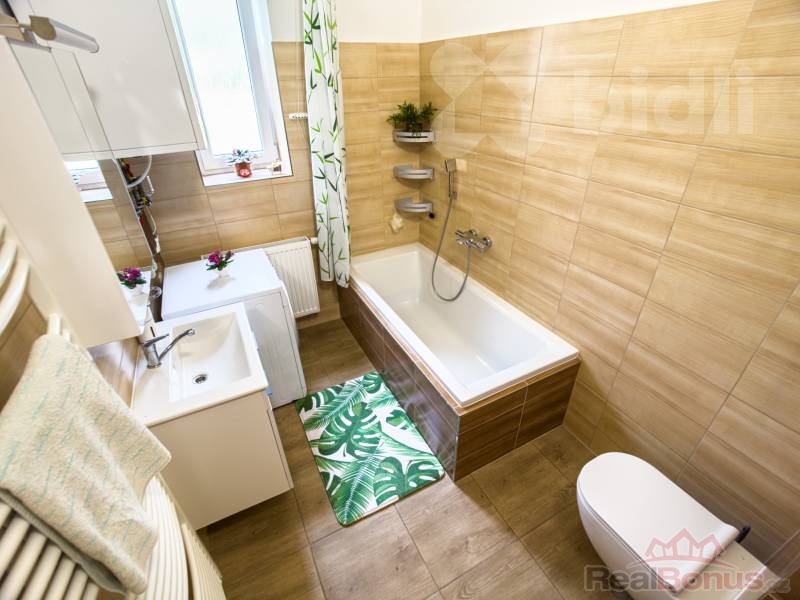 Kuchyň je s rohovou kuchyňskou linkou, vestavným sporákem a praktickou potravinovou skříní. Prostorný obývací pokoj je s vyvýšenou dřevěnou postelí díky vyšším stropům. Koupelna s vanou, umyvadlem, oknem, místem pro pračku a kotlem. V patře, kam se dostaneme po dřevěných schodech je velký pokoj, po bocích se šikmými stropy po obou stranách, lze tam mít tedy i šatnu.